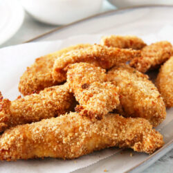 Serve the chicken tenders with your favorite dipping sauces and a side of fries or a salad (we had a tomato salad) for a healthier option.