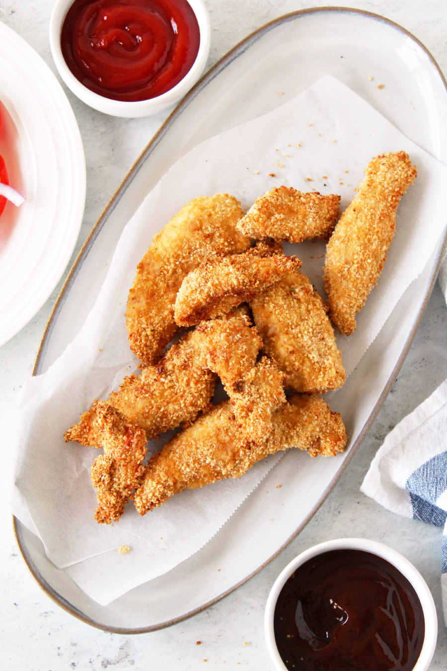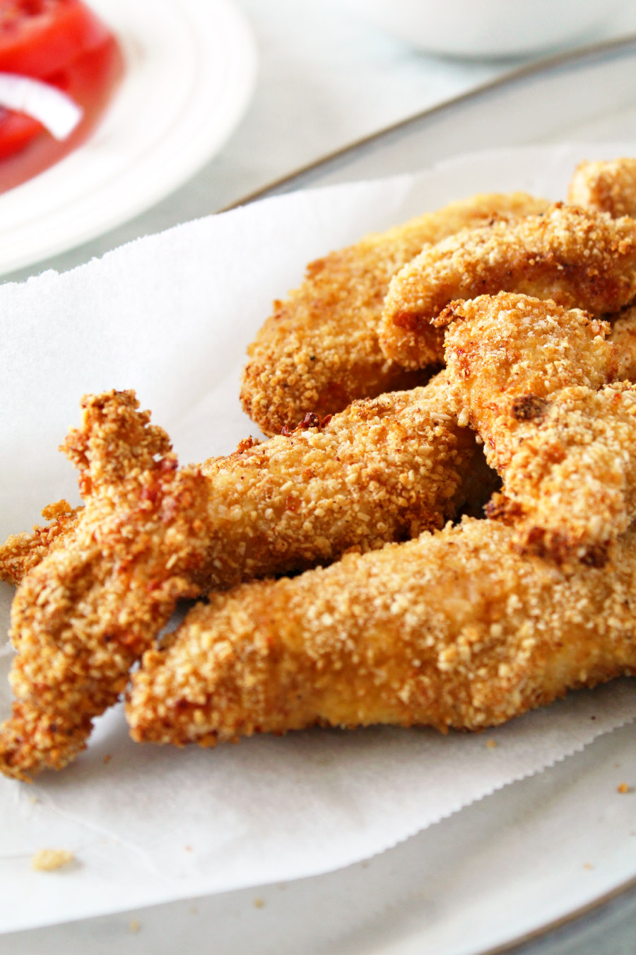 Serve the chicken tenders with your favorite dipping sauces and a side of fries or a salad (we had a tomato salad) for a healthier option.