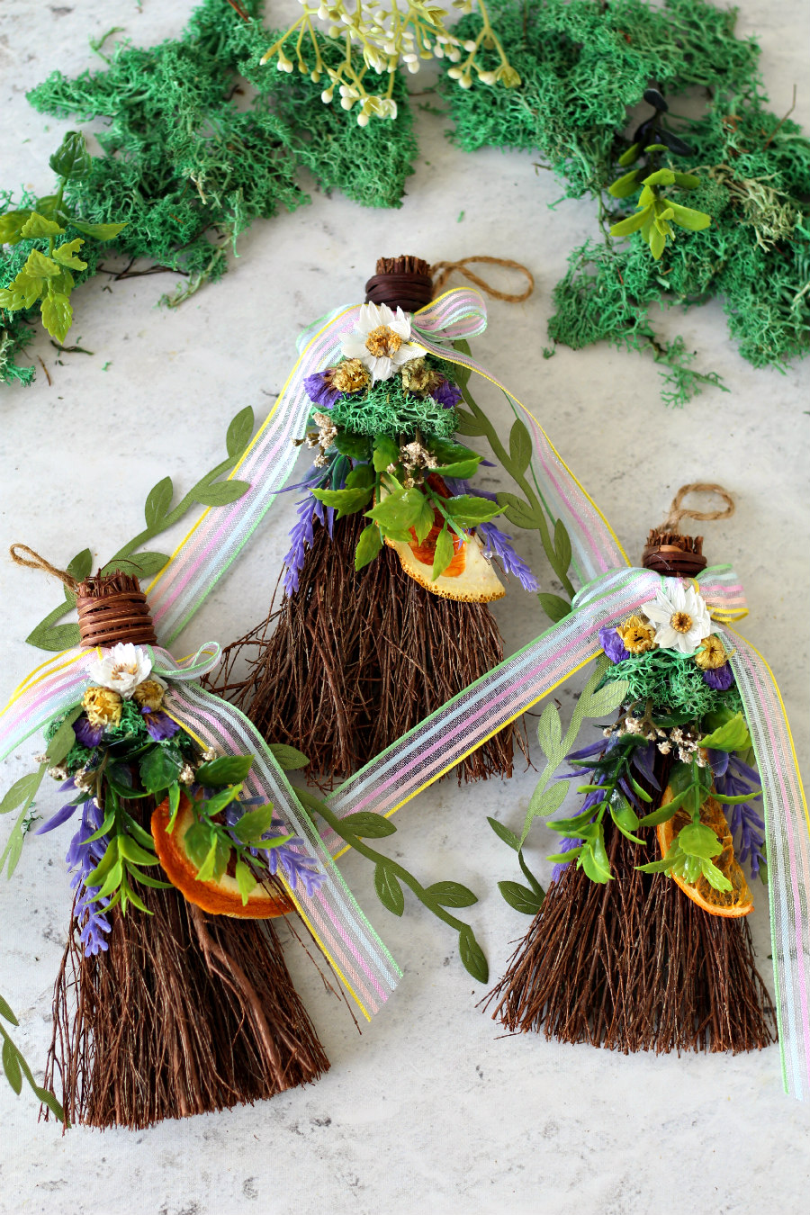 Beltane and May Day are incredibly colorful celebrations with traditions including dancing around the maypole with ribbons and wearing flower crowns. I wanted to bring that symbolism into these brooms. So they're decorated with soft moss, a mix of dried and faux florals, an orange slice (to represent fire energy and the sun), and of course, some pretty ribbons.