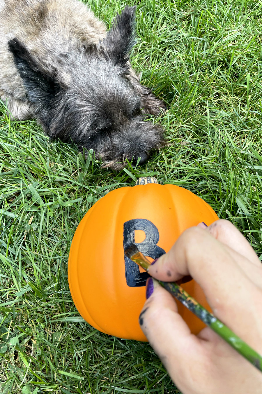 So Hunter and I had a crafternoon and created a really cute Halloween pumpkin together! Hunter really isn't into having his paws touched, but he can be persuaded into things with treats. I gave one of his paws a quick paint job and pressed two paw prints onto the pumpkin. I made sure to leave room to paint the letter "B" before the paw prints. Then, I quickly wiped off Hunter's paw and left the paint to dry.