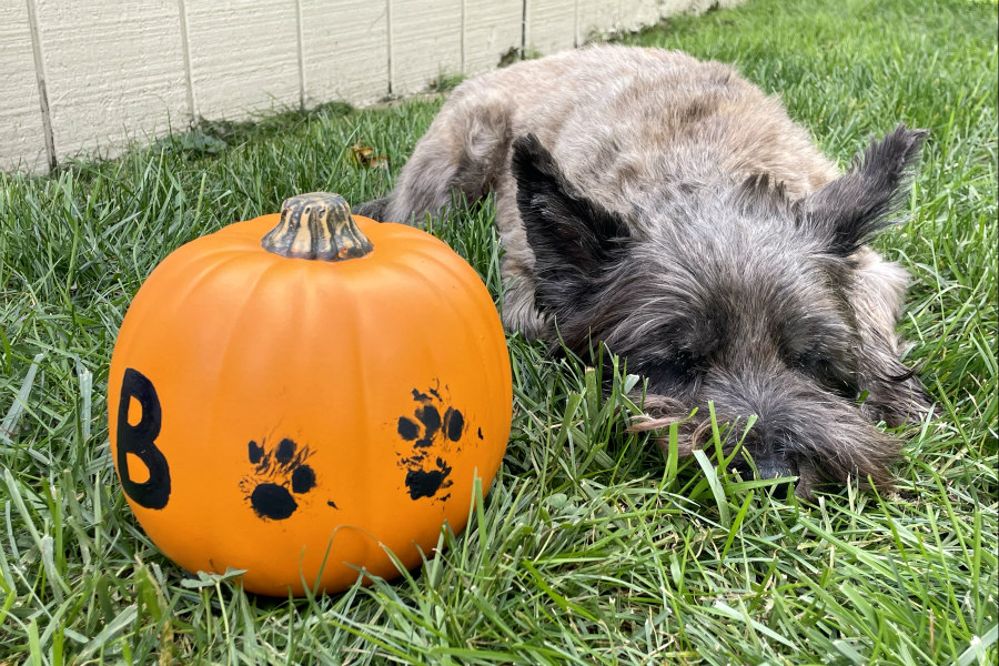 2. If necessary, add more paint to the paw. Then, add another paw print to the pumpkin leaving room to add a "B" in front. Wipe off your pet's paw.