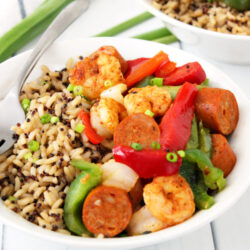 All it takes to make this recipe is Cajun-Style Andouille Chicken Sausage, shrimp, blackening seasoning, thyme, bell peppers and onion, and a brown rice blend. And this rice bowl is perfect for meal prepping with just the right amount of kick!