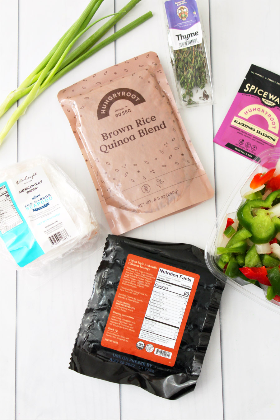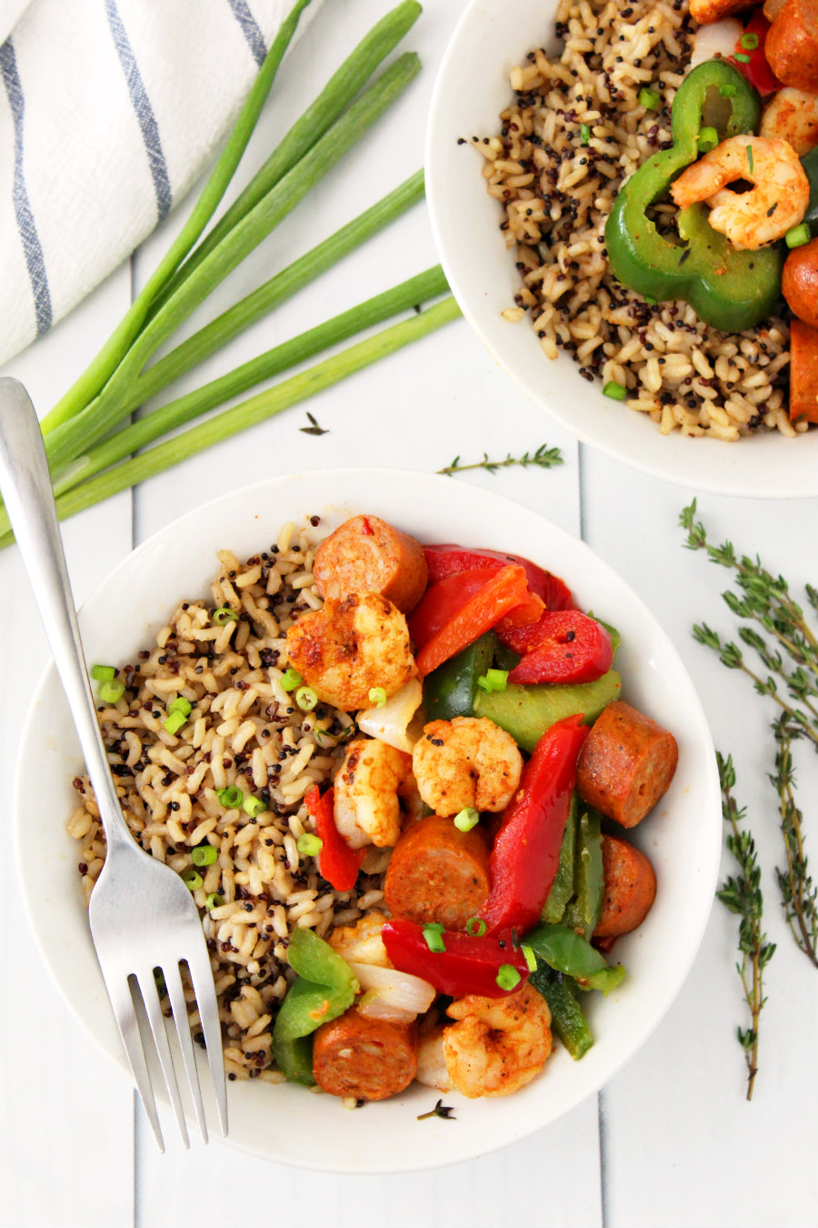 All it takes to make this recipe is Cajun-Style Andouille Chicken Sausage, shrimp, blackening seasoning, thyme, bell peppers and onion, and a brown rice blend. And this rice bowl is perfect for meal prepping with just the right amount of kick!