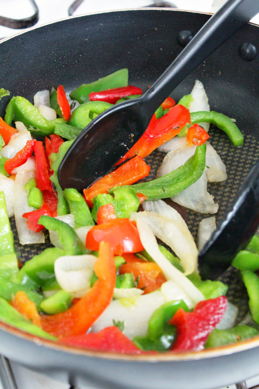 Then, add a little more olive oil, if needed, and add the bell peppers and onions. Cook just until softened and stir in the fresh thyme leaves.