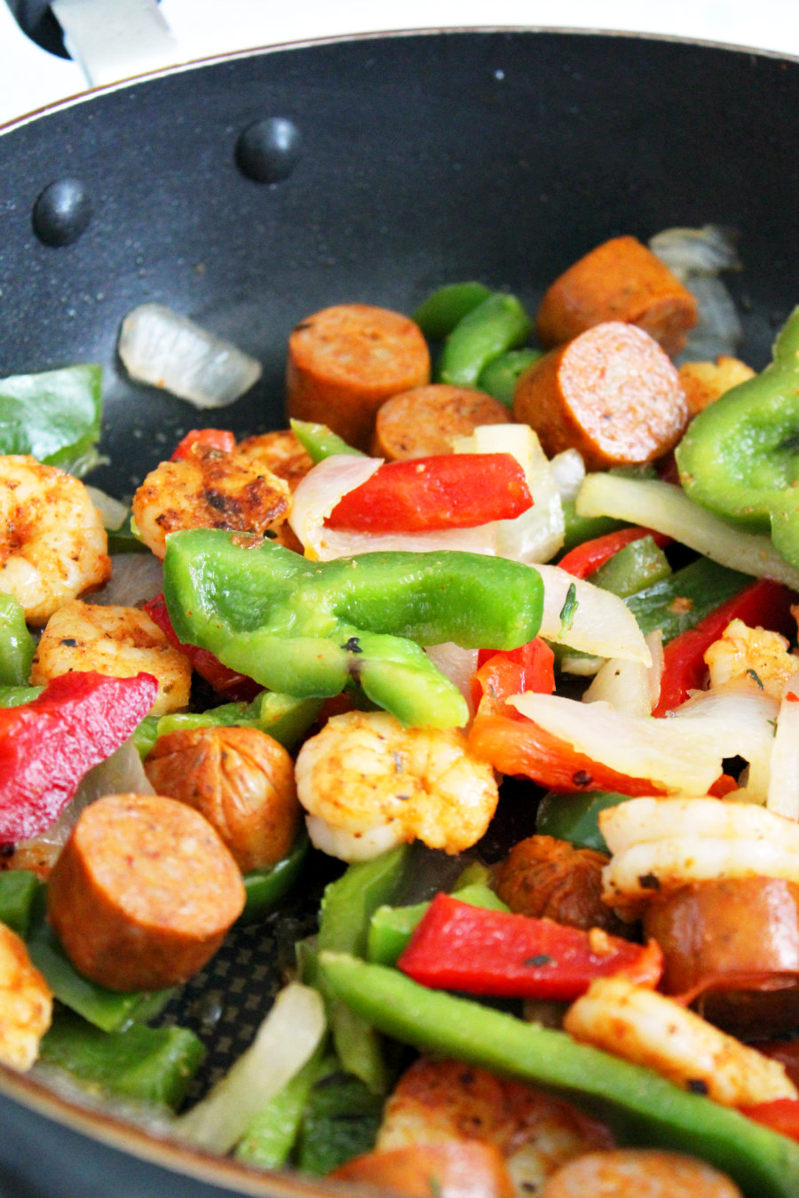 Add the shrimp and sausage back into the skillet to warm it up. Toss with the peppers and onions to combine.