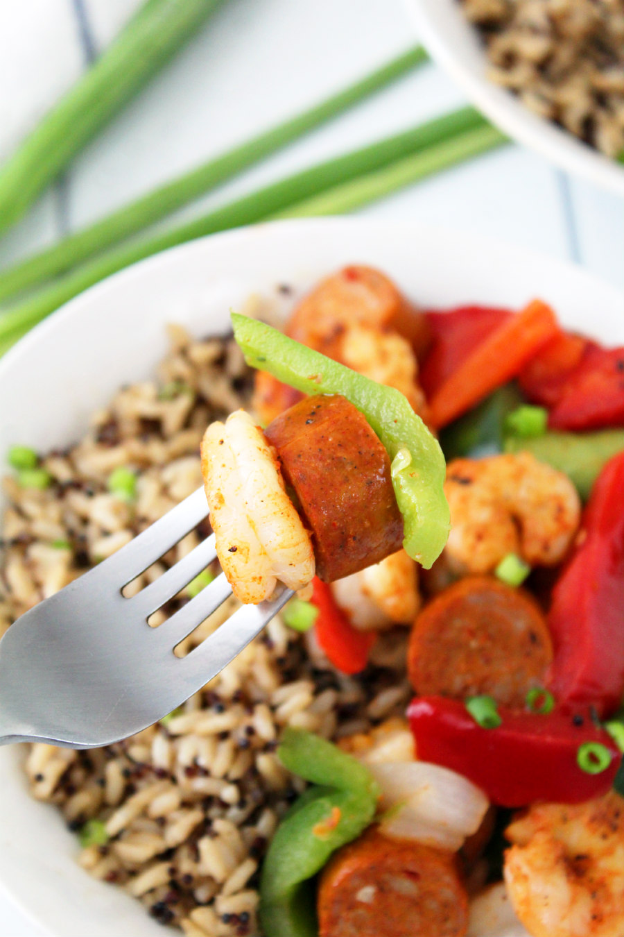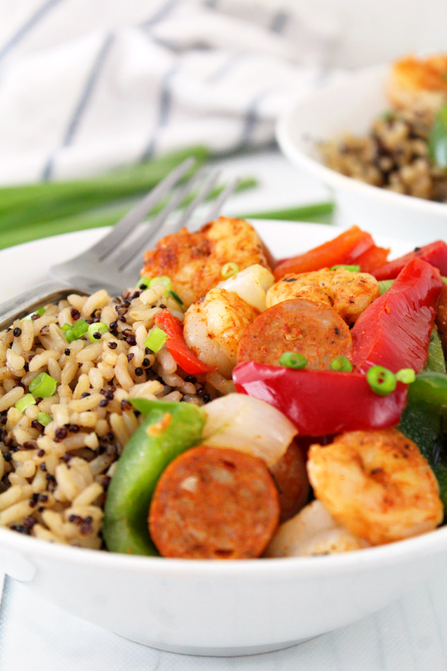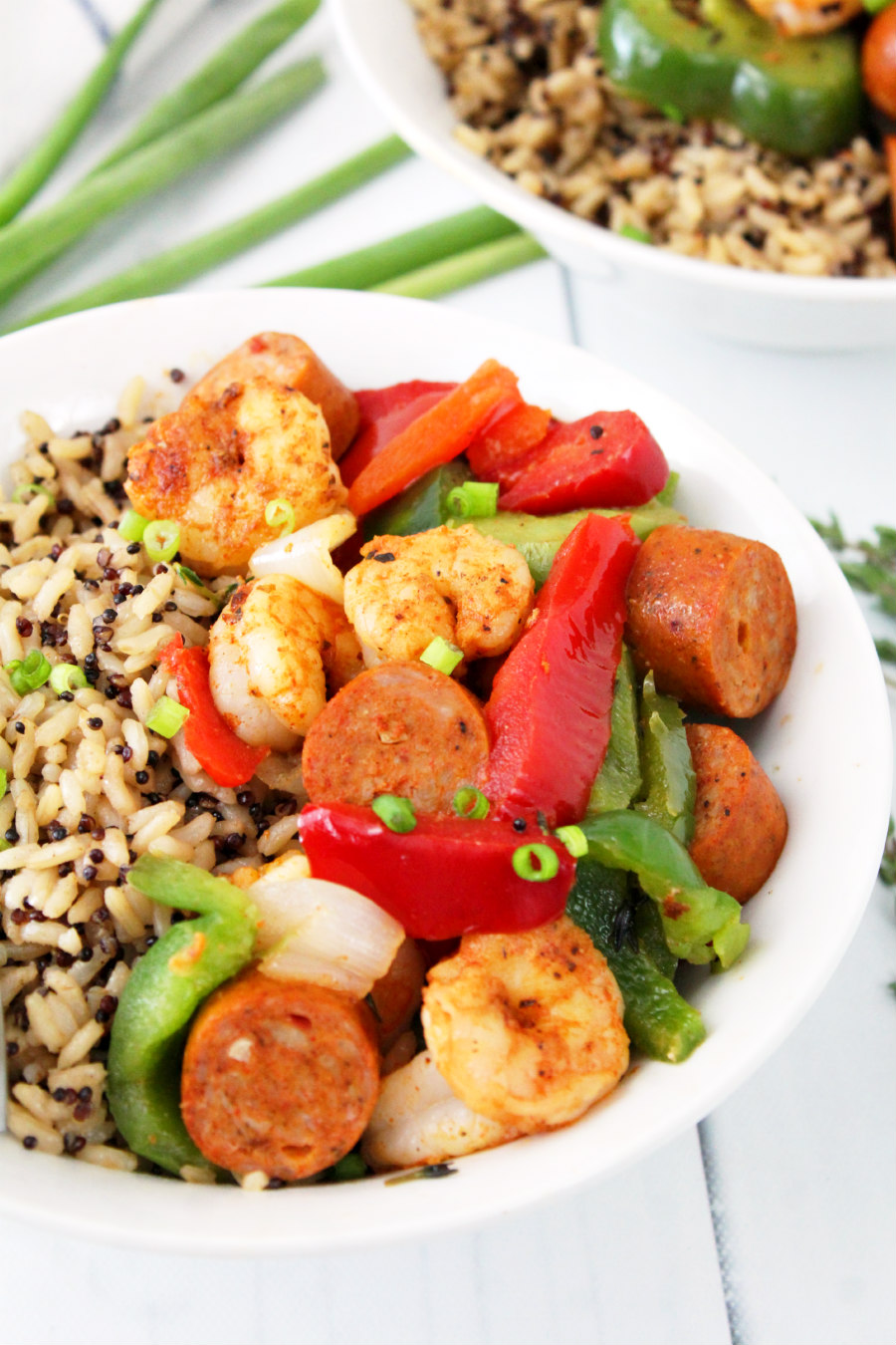 Then, top each bowl with sausage, shrimp, peppers, and onions. Add chopped scallions for garnish, if desired, and serve.