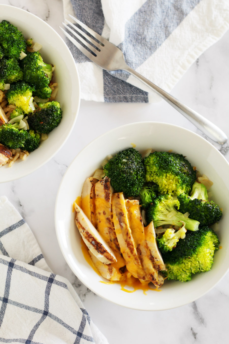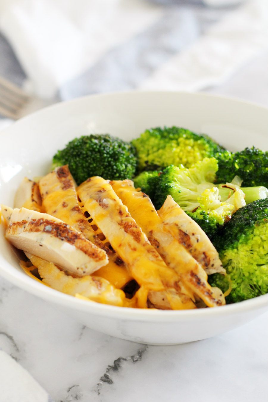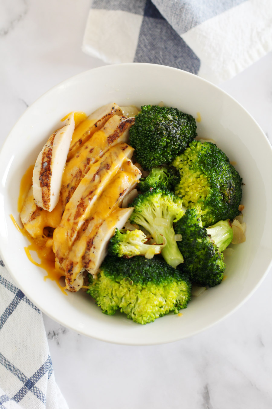 - Divide chicken and broccoli mixture between bowls. Top with cheese. Allow cheese to melt and serve.
