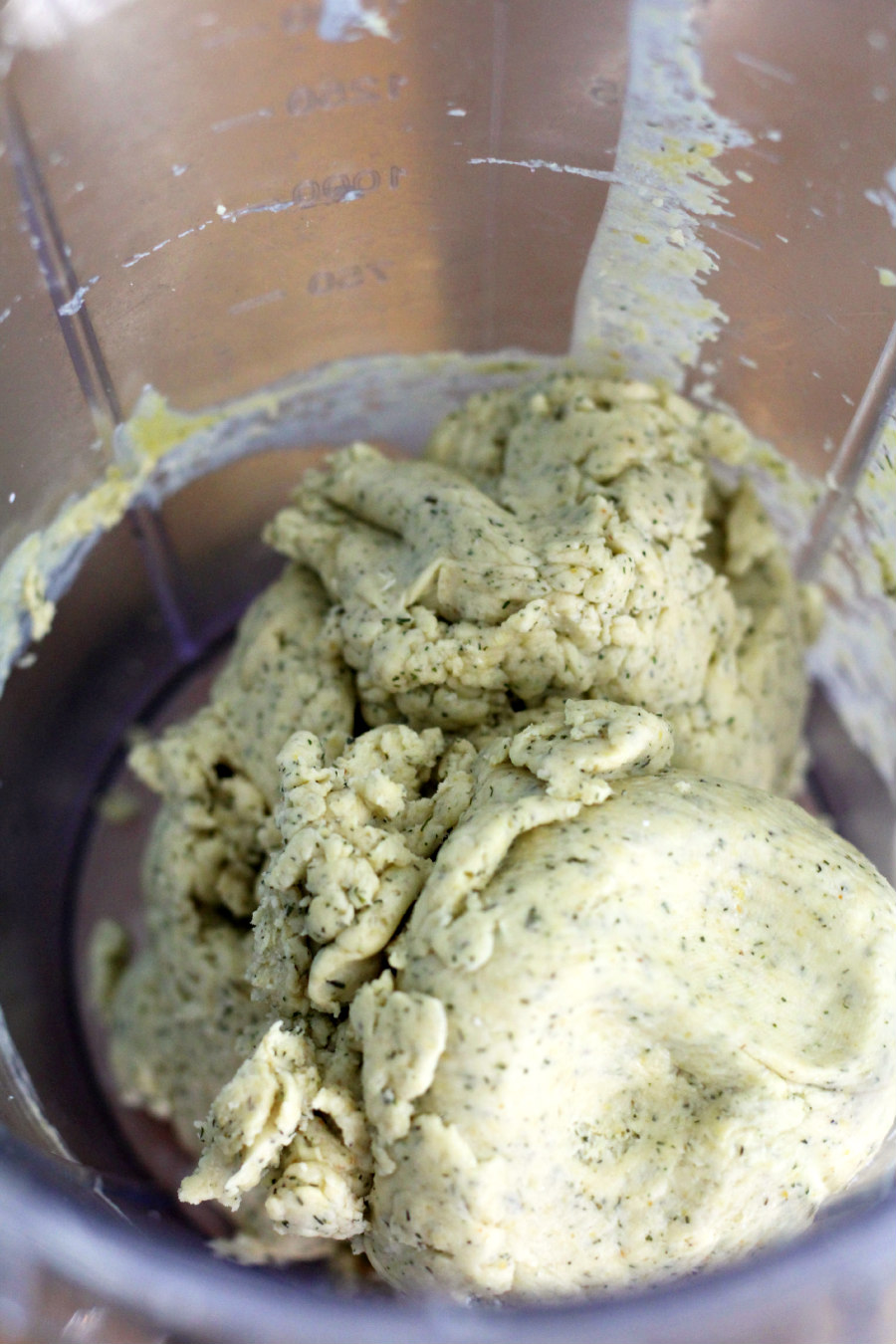 To start these crackers, we need to whip up the dough, which is super easy to do. Just add all of the ingredients into a blender or food processor and pulse just until combined. If you add a little water while mixing, it'll help things move along and come together.