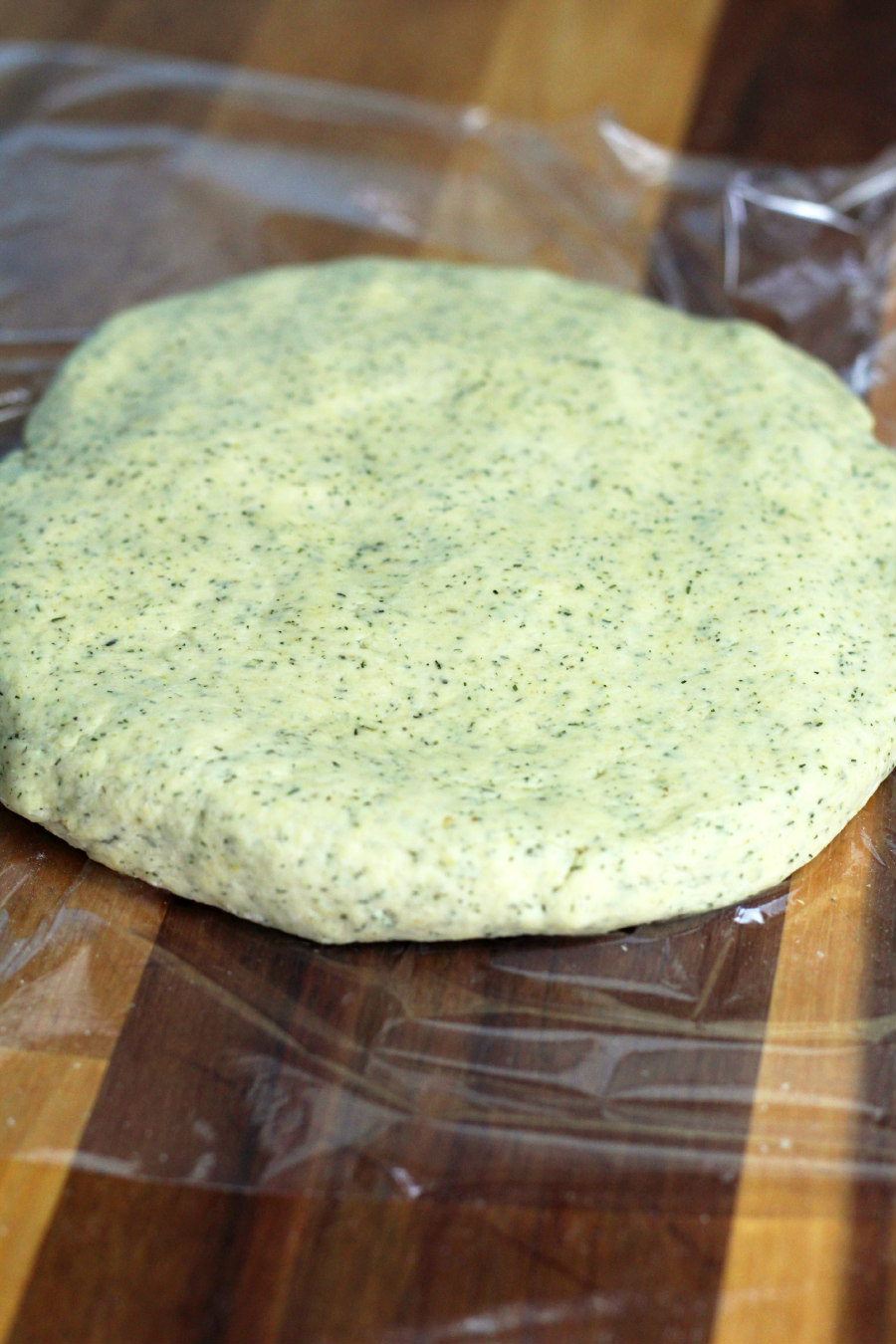 With the dough made, form it into a disc and wrap it up in plastic wrap. Let the dough chill in the fridge for about 30 minutes.