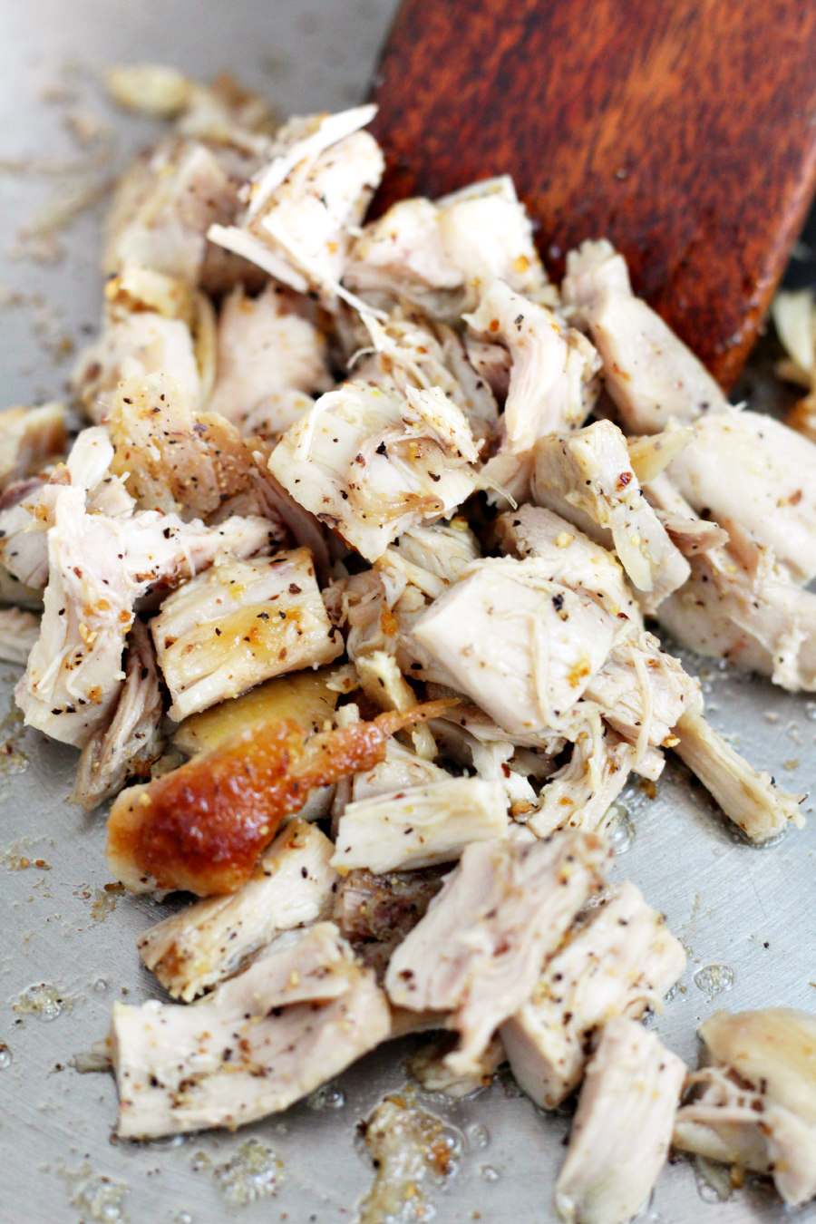 • Start topping with the chickpeas, edamame, almonds, feta cheese, and chicken.