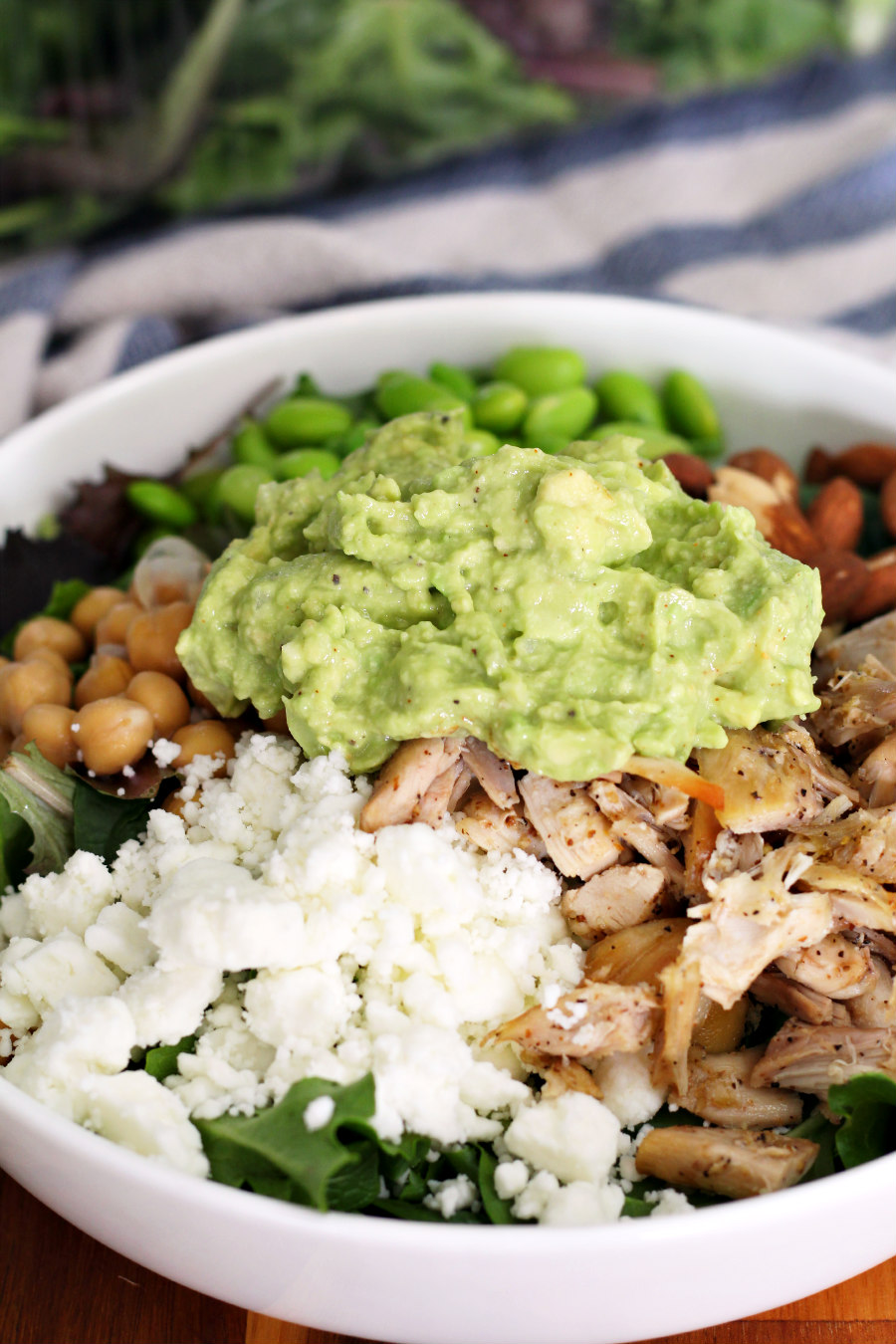 Now, grab a salad bowl or plate and place the spring mix onto it. Start adding the chickpeas, edamame, feta cheese, almonds, and the chicken. Add a hefty dollop of guacamole on top.