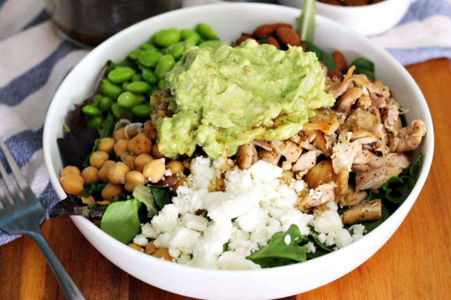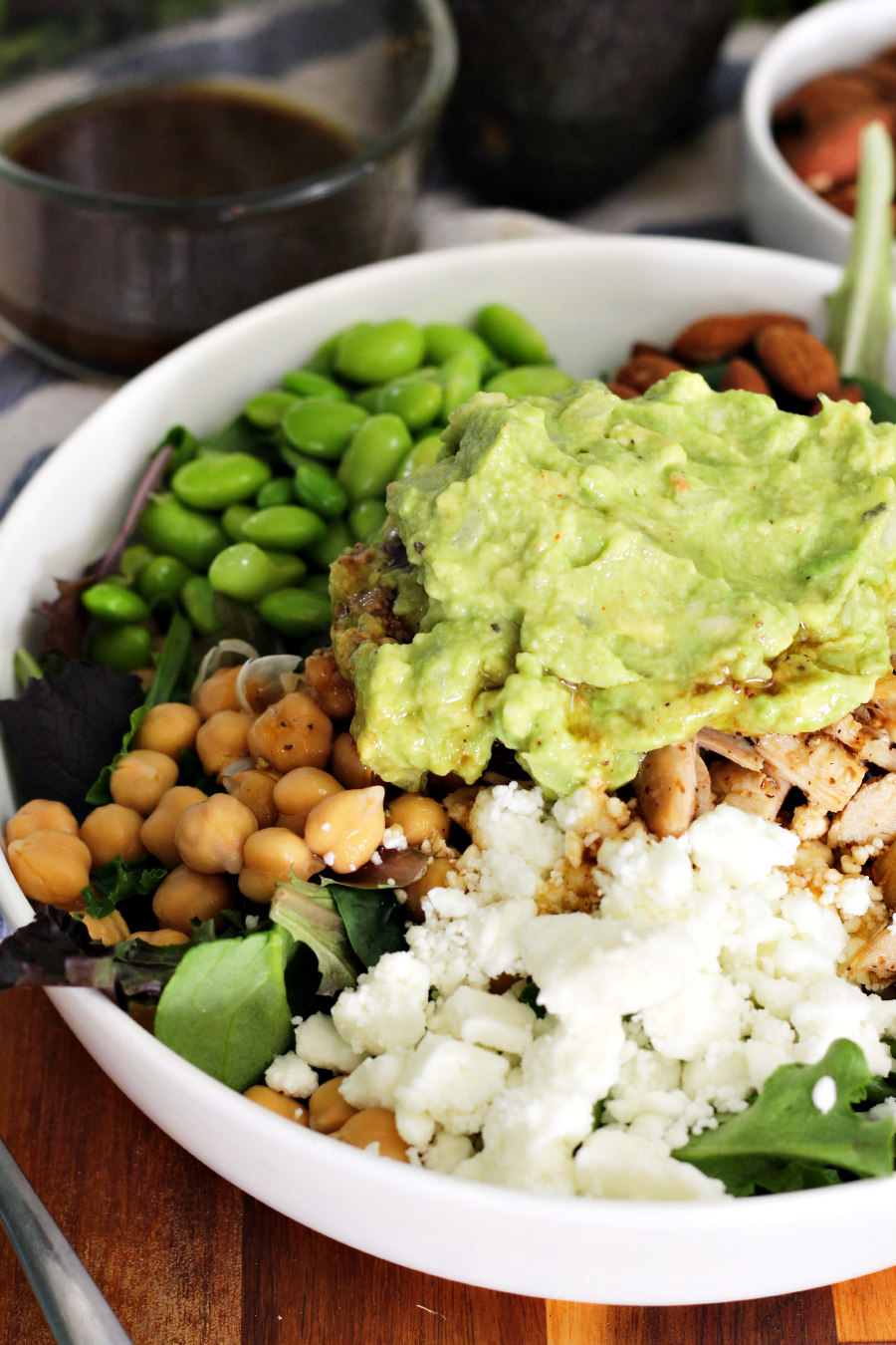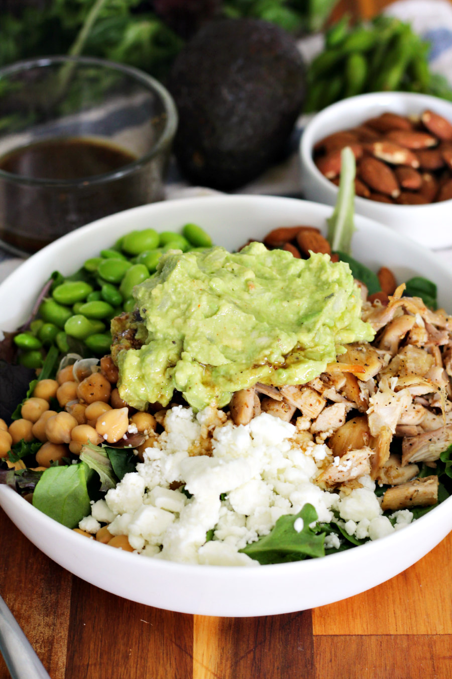 This Copycat Wegmans Protein Power Salad is a fresh and satisfying, high-protein salad made with chicken, chickpeas, edamame, almonds, feta cheese, and guacamole finished with a flavorful homemade balsamic dressing.