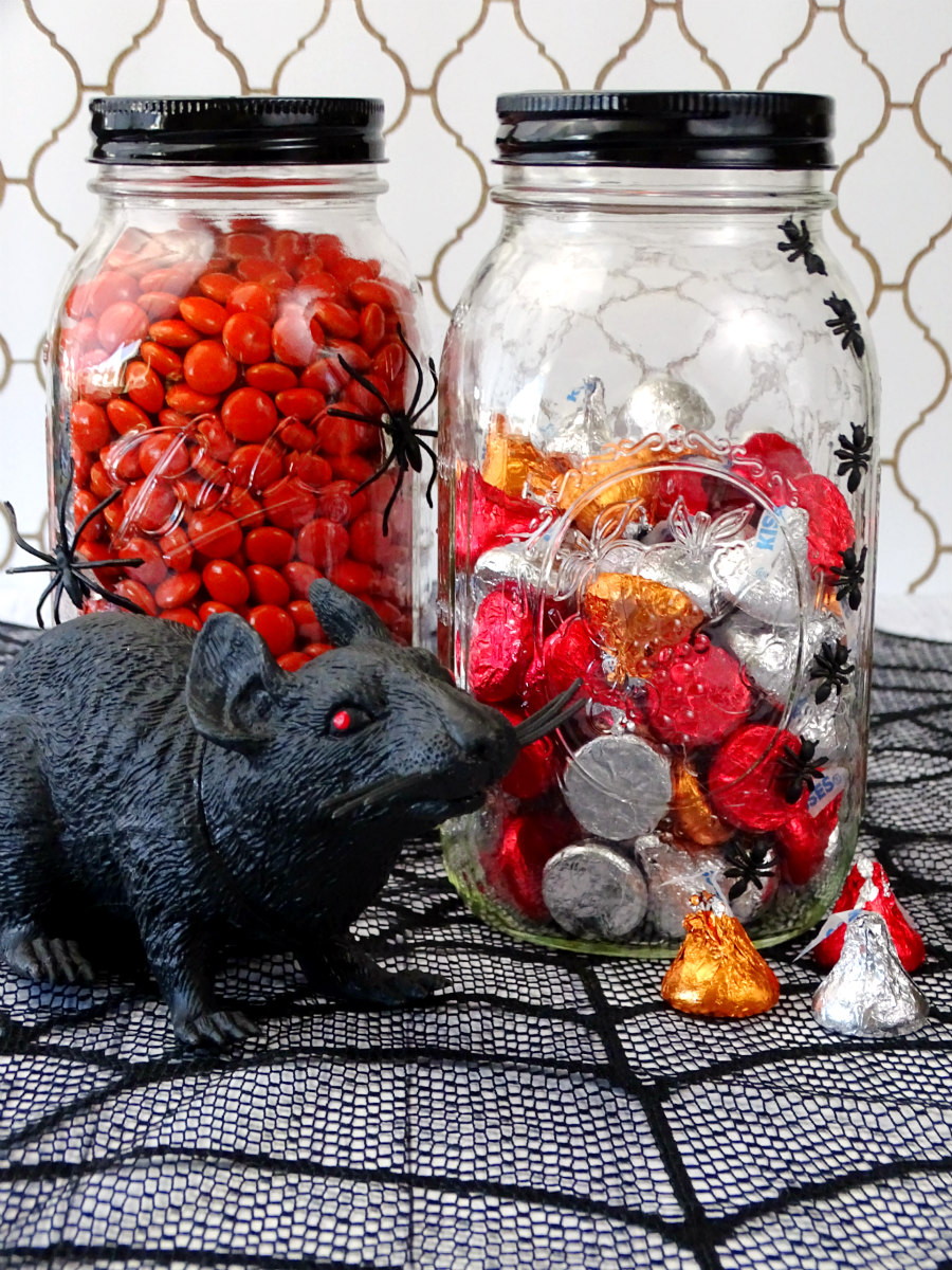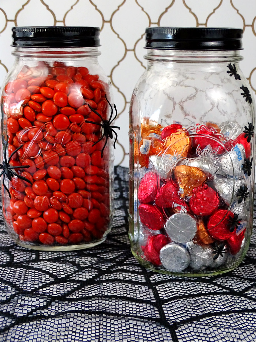 Leftover Halloween candy will look sweet in these DIY Creepy Halloween Candy Jars. This easy project is made with glass jars and plastic bugs. A little hot glue makes it look like they're crawling all over the jars!