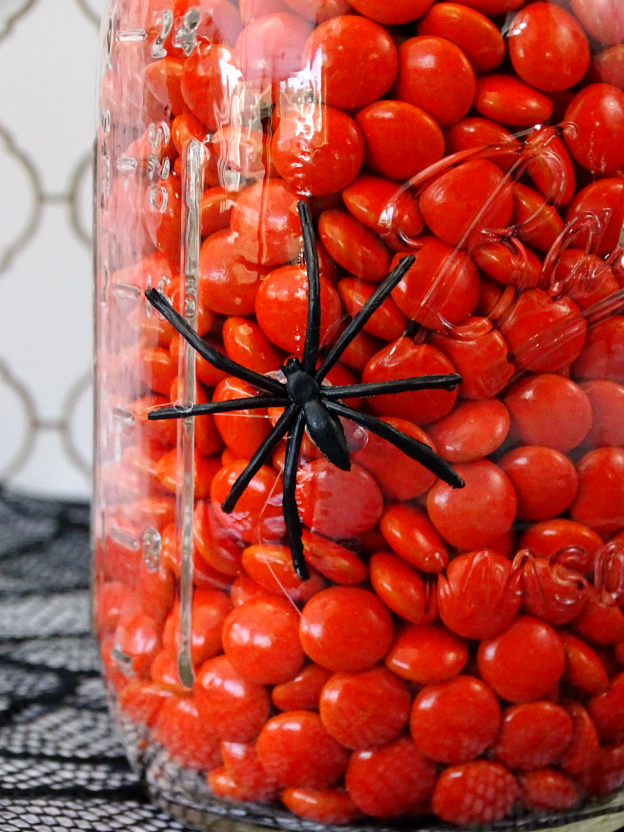 You might remember these ants from my DIY Halloween Fairy Garden project. In this project, they’re making their way up to the top of the mason jar, hoping to get inside and feast on Halloween candy. Gross! Then, there’s the spiders. A couple eight-legged critters decided to join the party and hopped onto a jar of their own!
