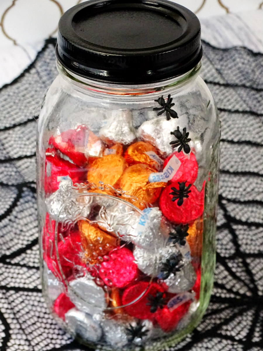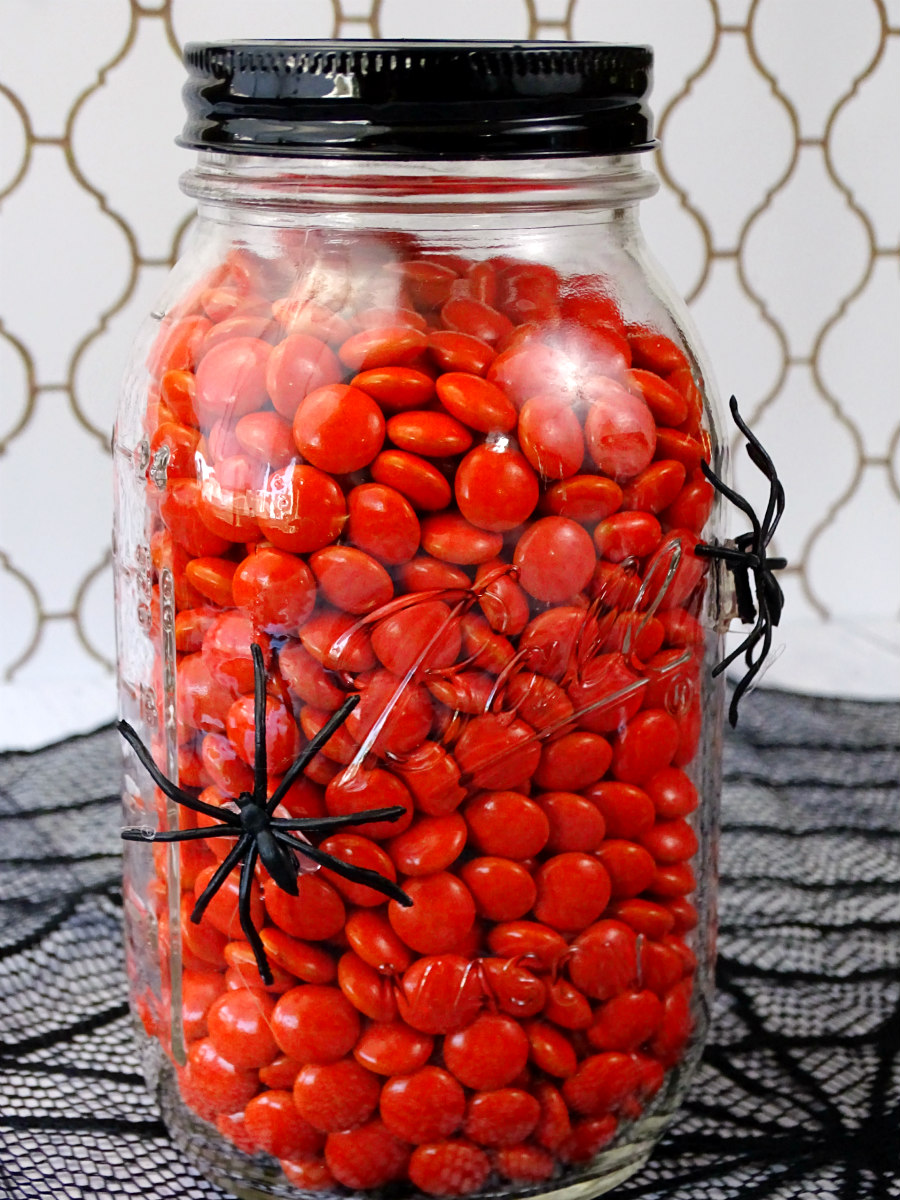 - When the glue is dry, fill the jar with your favorite Halloween candy, put the lid back on, and display!