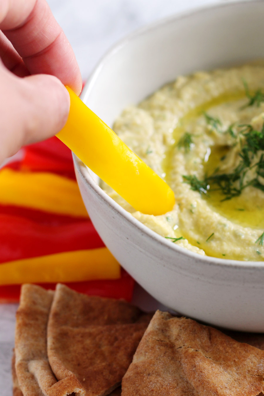 My little pot of fresh dill is growing out of control! I seriously can't use it fast enough! So I've been trying to add it to dishes or make dips with it. Since we've been doing a lot of healthy snacking around here lately and had a fridge full of veggies, I decided to make a dill pickle flavored hummus.