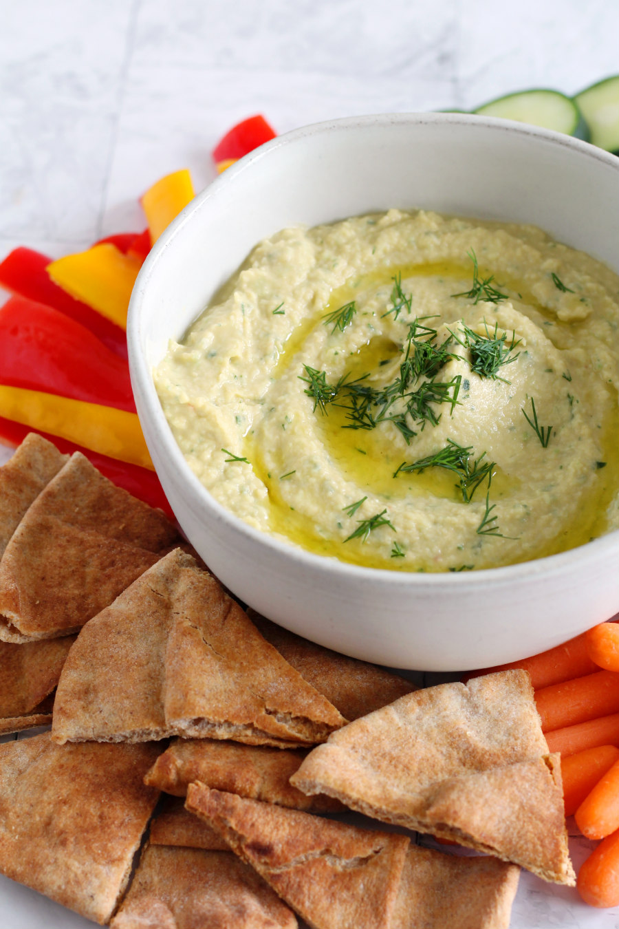 - Once hummus is smooth and creamy, add fresh dill, cucumbers, and crushed red pepper.