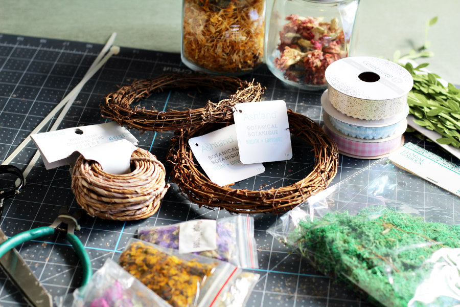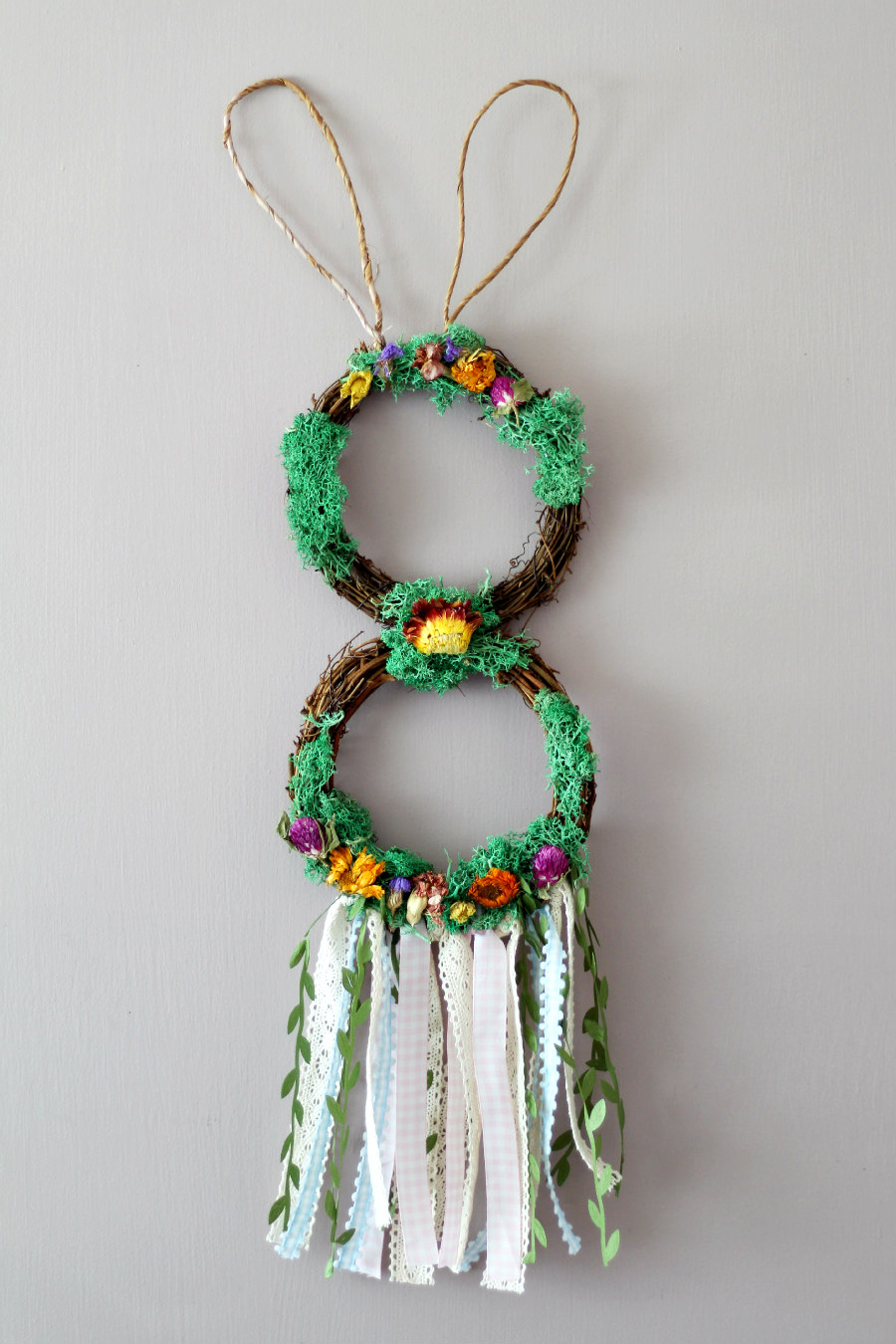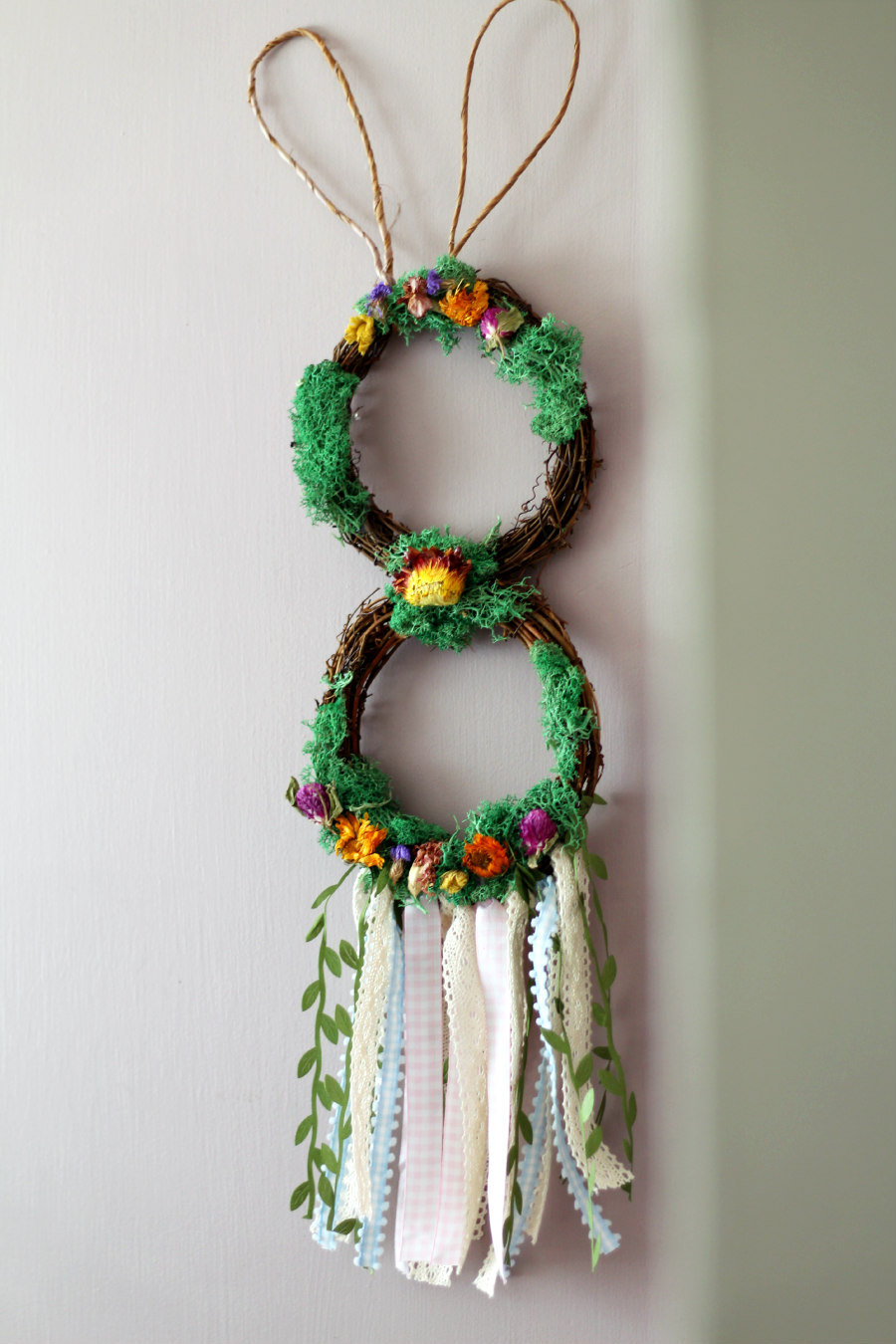 This wreath is super simple to make, starting with two mini grapevine wreaths. The bunny ears are shaped using natural wrapped wire creating the cutest silhouette. Then comes the fun part - decorating it with those special springtime touches. Ribbons drape softly from the bottom of the wreath while preserved reindeer moss and dried flowers add texture and color to create the sweetest springtime decoration.