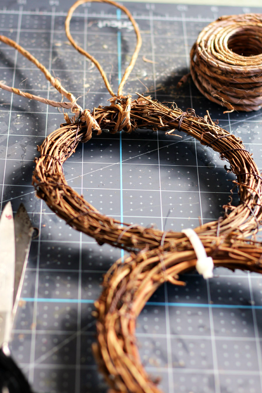 The first thing we need to do is form our wreath base. Take the two grapevine wreaths and attach them together with a zip tie. Clip the excess zip tie. Then, cut two pieces of the wrapped wire with wire cutters, cutting them a bit longer than you intend to use for the rabbit ears. Form each piece of wire into a rabbit ear shape and attach to the wreath by wrapping the excess wire around the wreath.