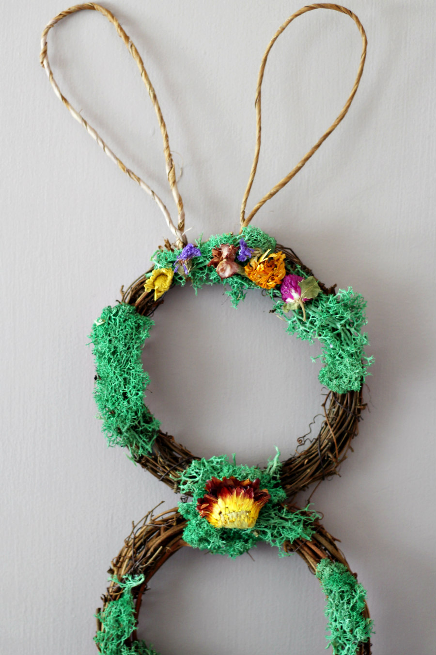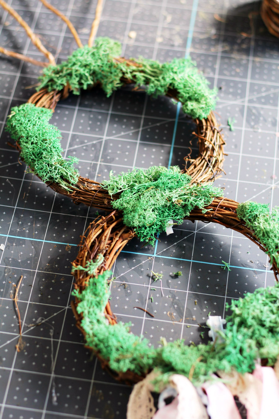 Next, heat a glue gun and start gluing moss around the base of the wreath. You can either completely coat the wreath in moss or space it out around the wreath. I spaced it out, making sure to use it to cover the zip tie, the bottom of the rabbit ears, as well as the tops of the ribbon.