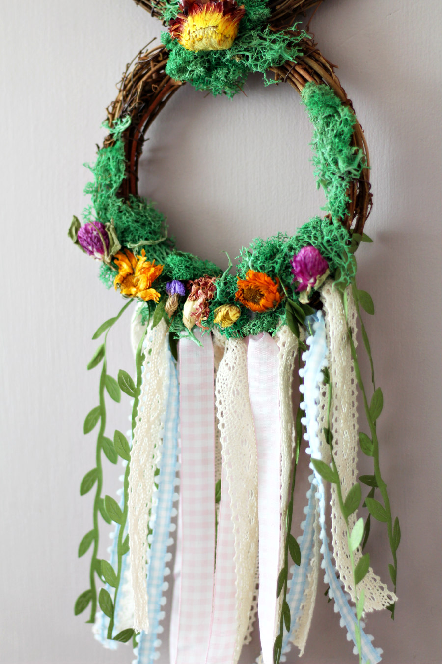 Glue dried flowers in place around the wreath. I used them to create a "flower crown" look as well as gluing them around the base of the wreath. If desired, add a loop of ribbon to the top of the wreath for hanging. Once the glue is completely dry, hang the wreath or gift it to someone special for Easter.