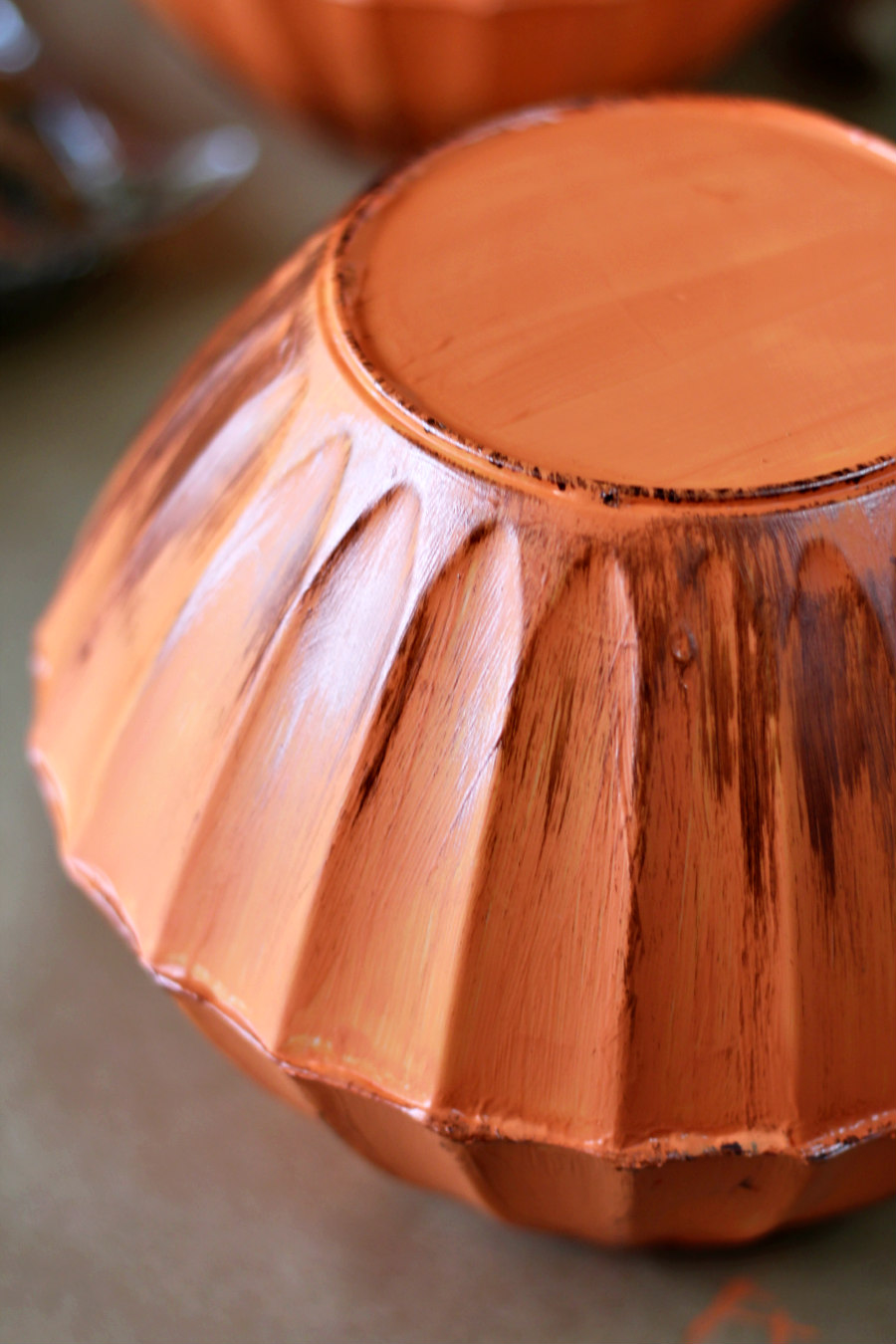 If desired, dry brush antique copper or brown paint around the raised edges to give the pumpkins a vintage, distressed look. Then, allow that paint to dry.