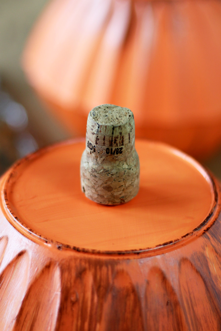 Once the paint has fully dried, we can glue a wine cork to the center of the pumpkin. If you'd like, you can paint the cork brown. I decided to keep it natural.