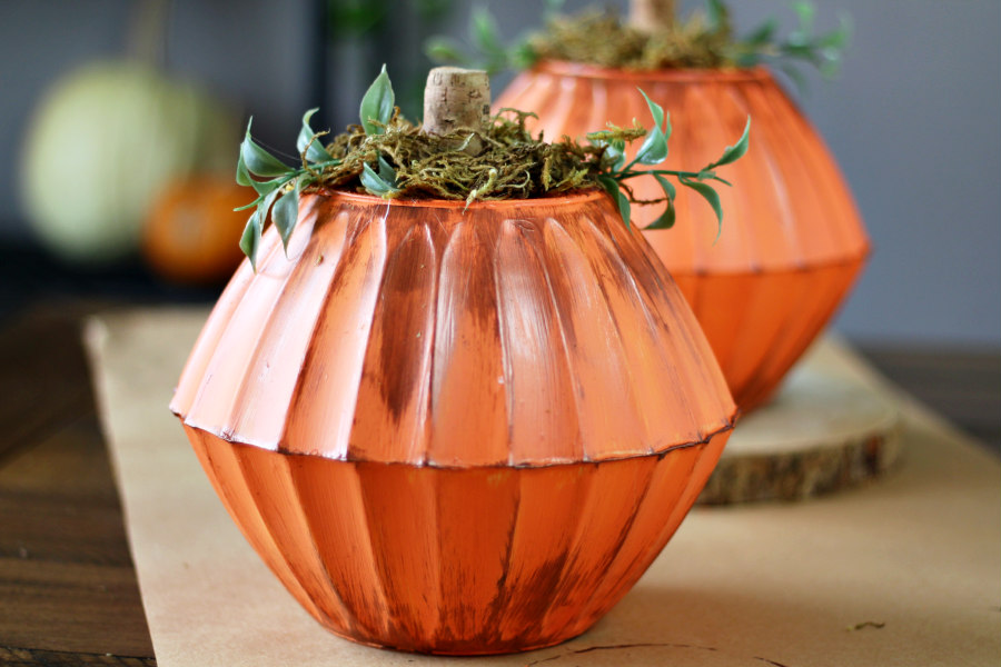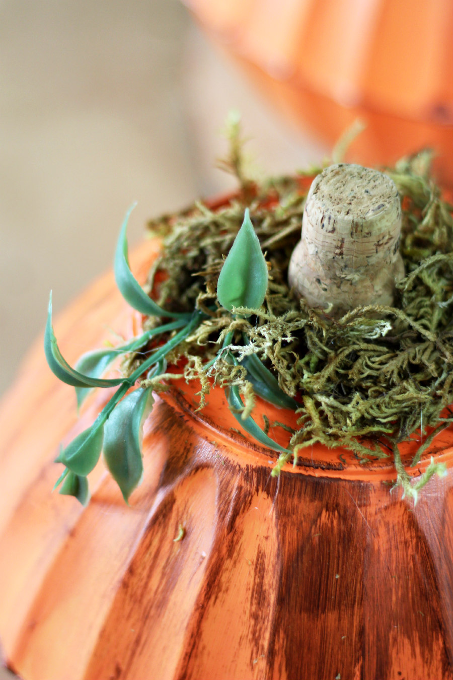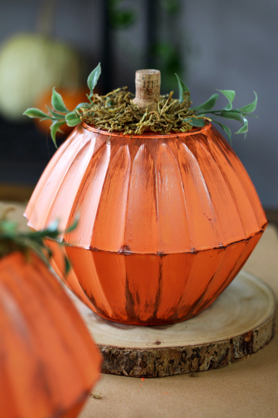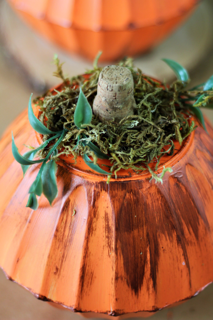 The DIY project turns two plastic dollar store bowls into oversized, vintage-inspired ornaments. I figured that the shape of the bowls would also work to make cute pumpkin decor. So I attached two bowls together with glue, painted them orange, and distressed them a bit just to give them that cozy, vintage feel. Then, I added a wine cork stem on top along with some moss and faux greenery to complete the look.
