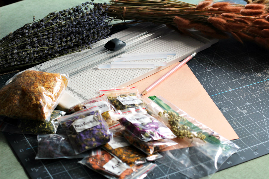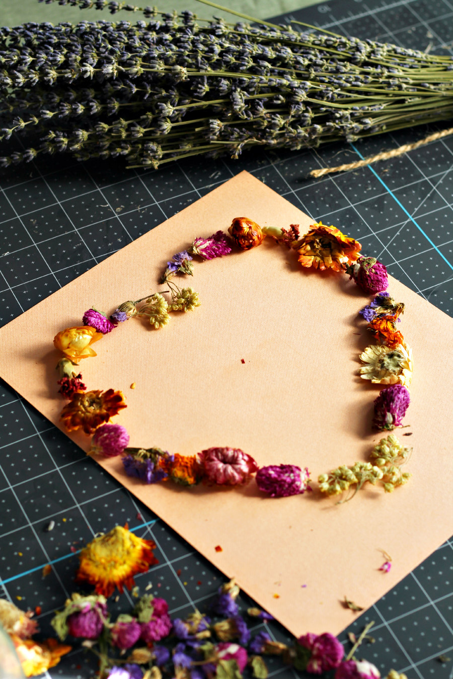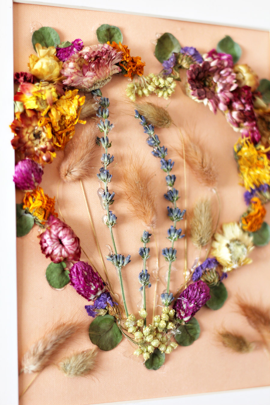 Choose the flowers you want to work with. I used a mix of dried calendula, yarrow, carnations, globe amaranth, chrysanthemums, purple myosotis, and eucalyptus for the outline of the heart. I chose to work with dried bunny tails and lavender for the inside of the heart.