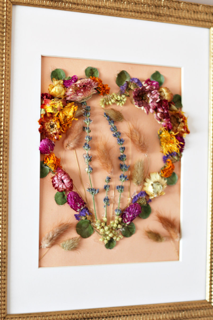 There are so many variations you can try with this project. Creamy, neutral tones create a farmhouse vibe while romantic dusty pinks add a classic Valentine’s Day look. The possibilities are endless, and once the holiday has passed, this dried flower art can easily transition into early spring decor.