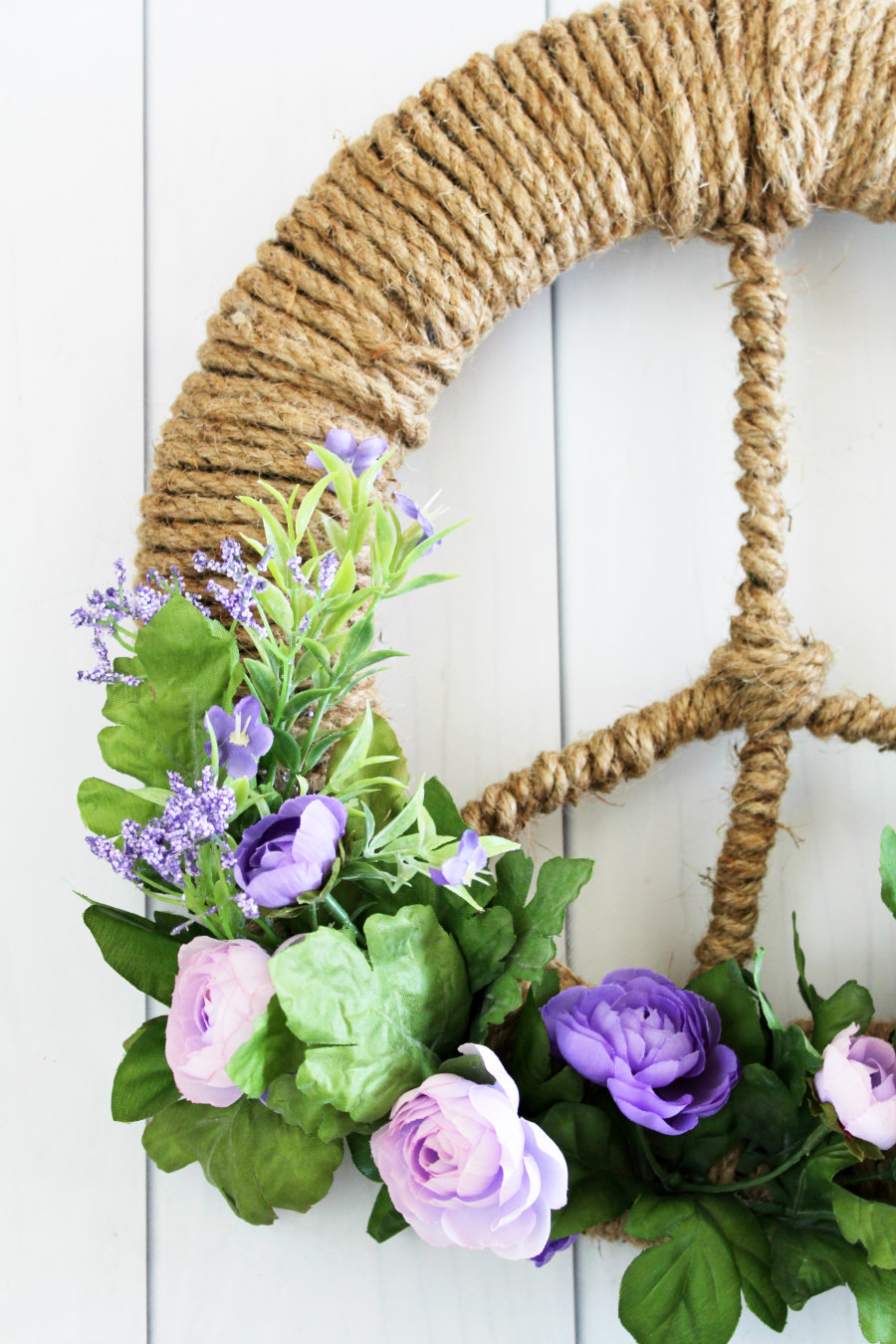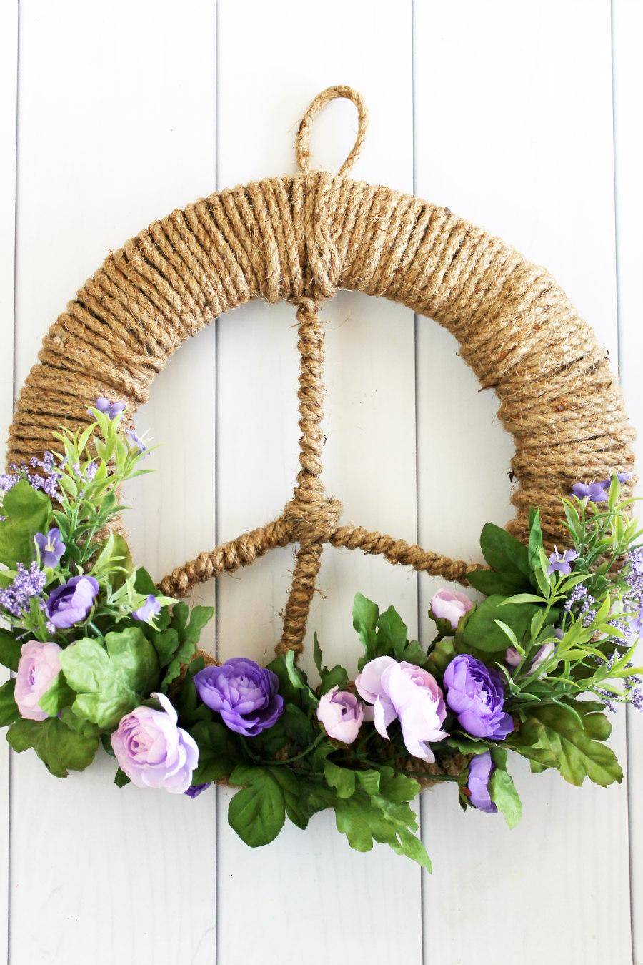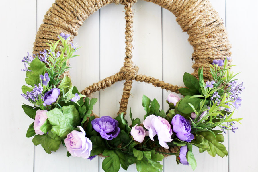 Give your front door a modern look with this easy Floral Peace Sign Wreath tutorial. A round wreath form is easily transformed into a peace sign with wire, rope, and faux flowers!