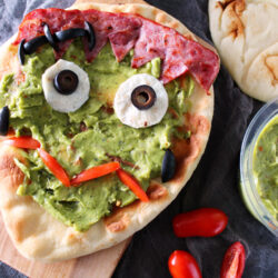 This breakfast flatbread is toasted and topped with guacamole. The Frankenstein monster face comes together with strips of bacon, egg white, black olives, and grape tomatoes. It's a deliciously spooky breakfast or brunch to serve on Halloween!