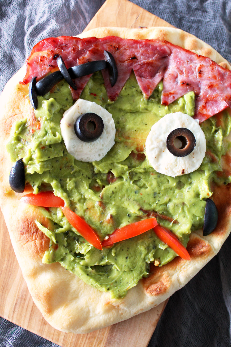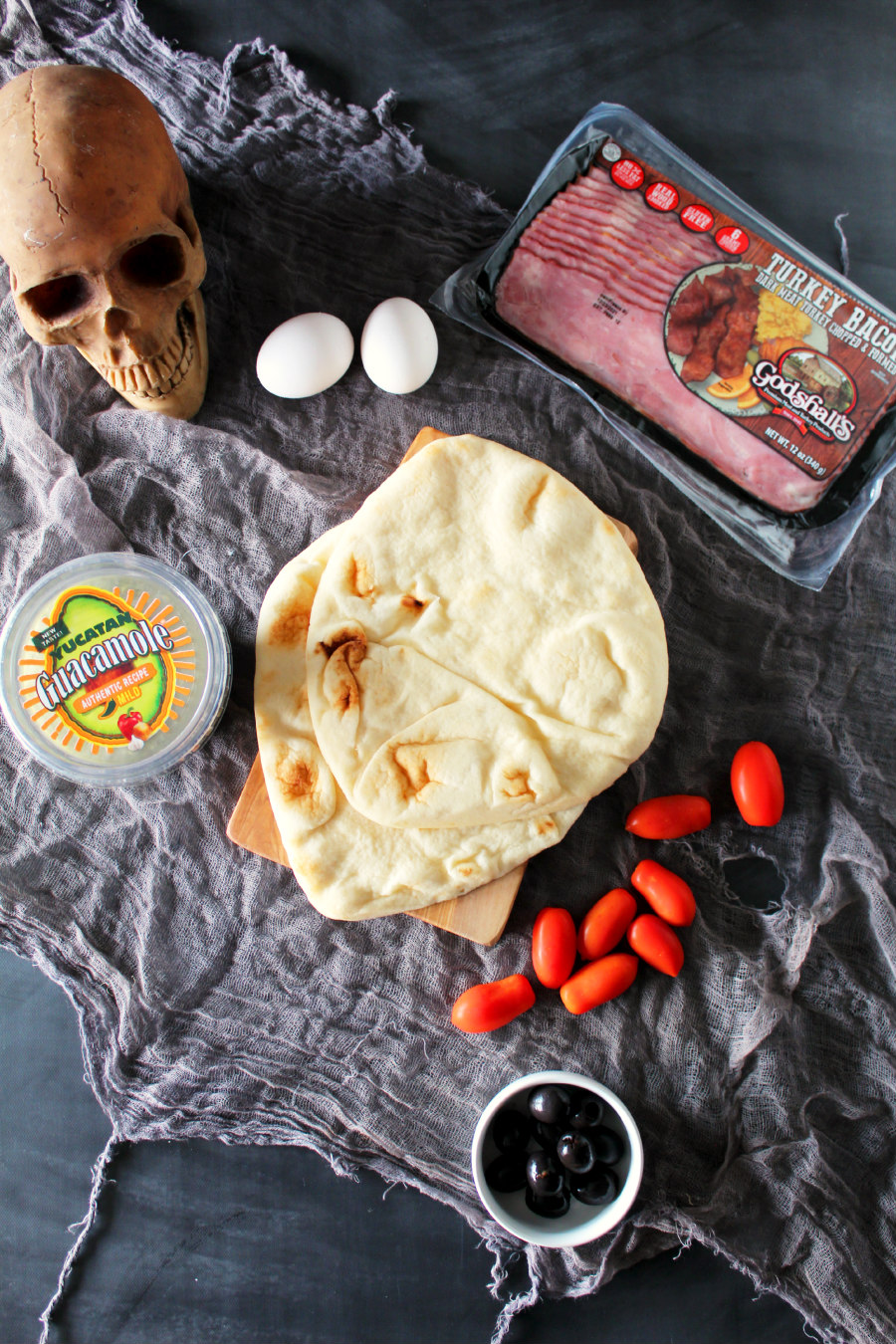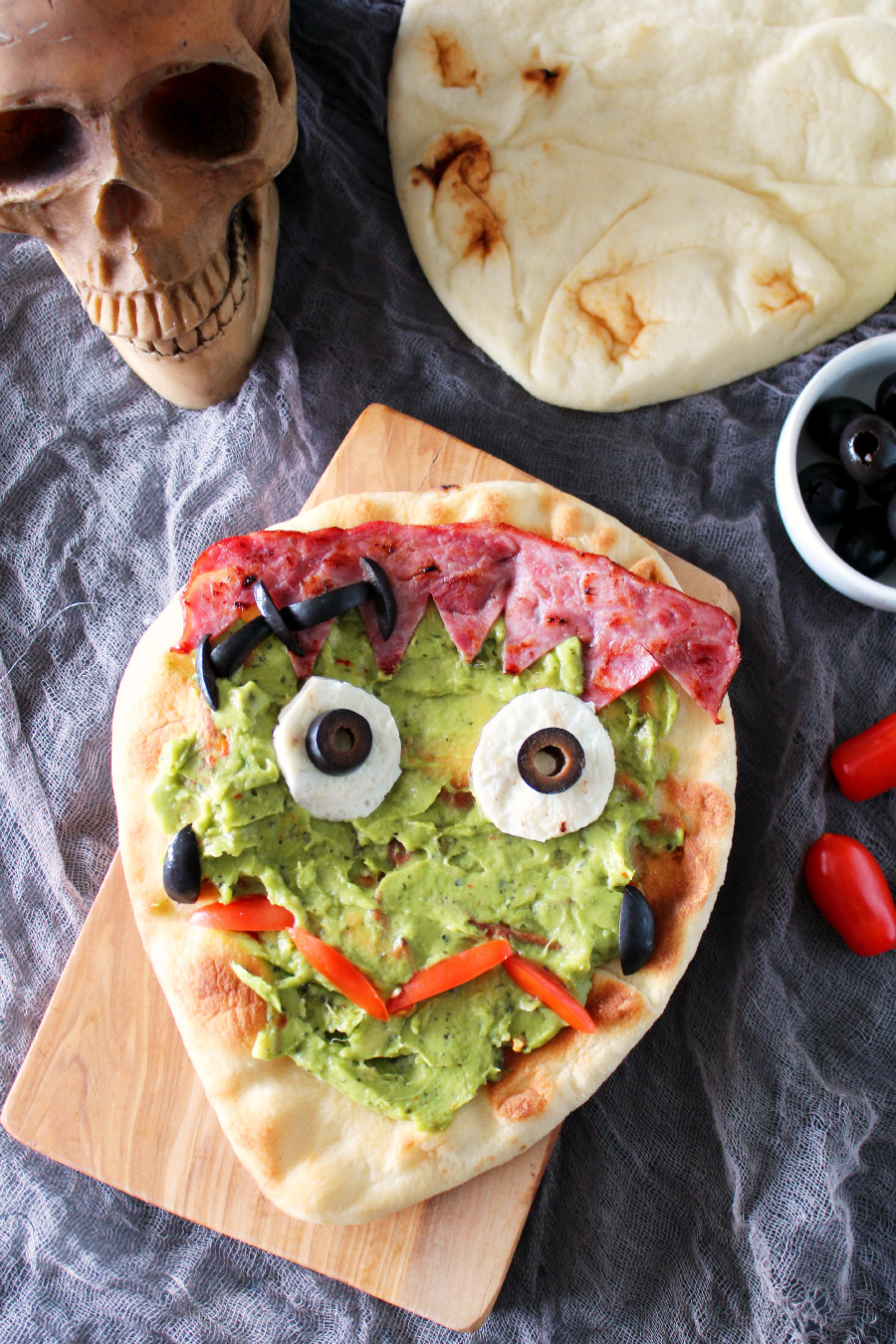 This Easy Frankenstein Breakfast Flatbread is a monstrously delicious way to start your Halloween morning! It's a spooky twist on avocado toast that's topped with guacamole, turkey bacon, egg whites, black olives, and grape tomatoes.