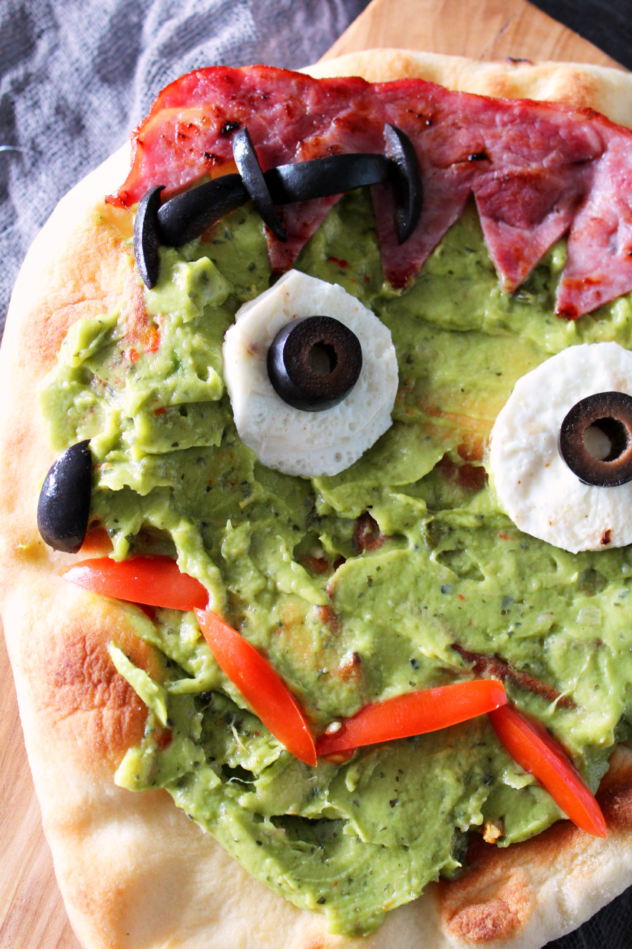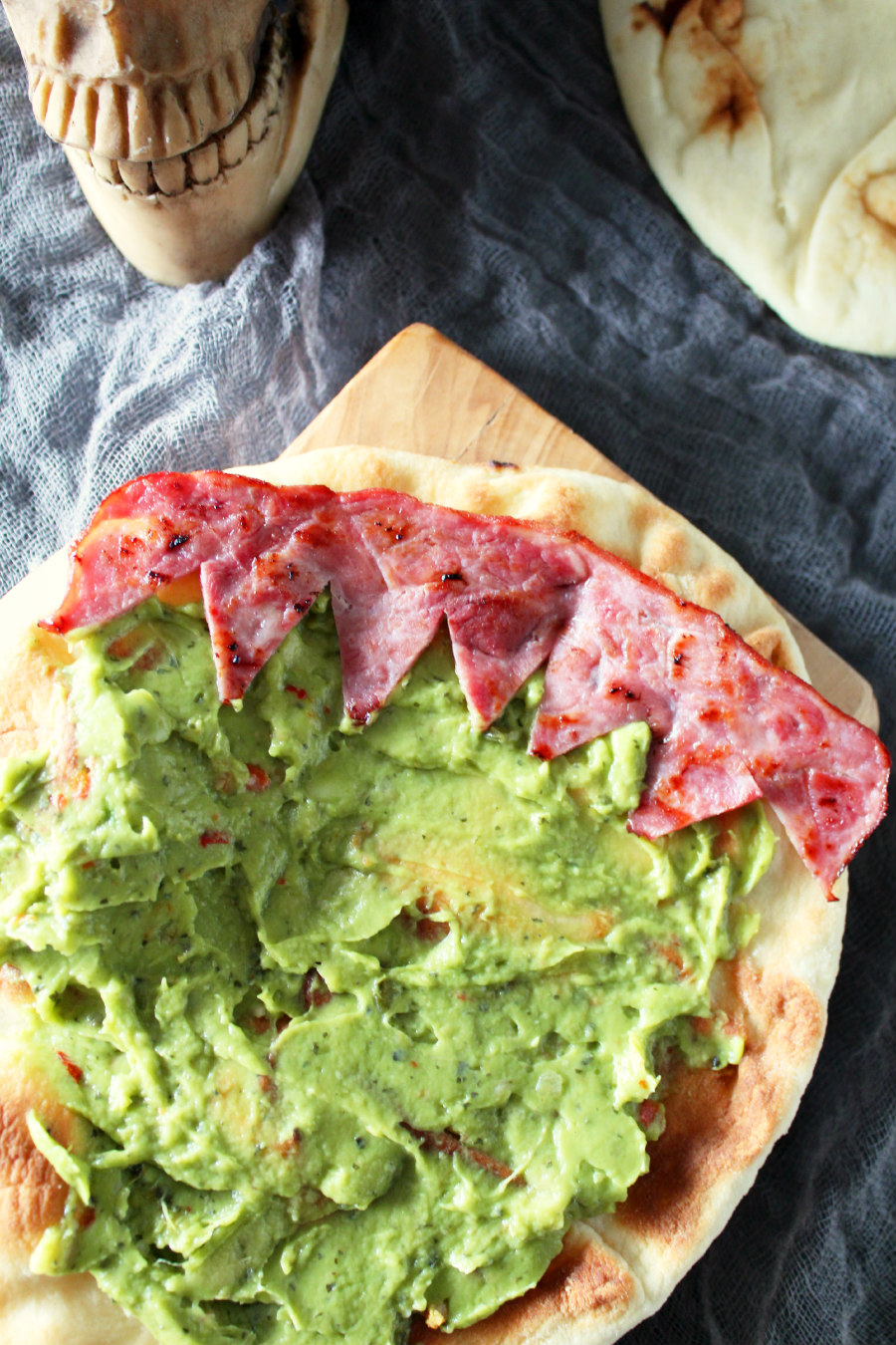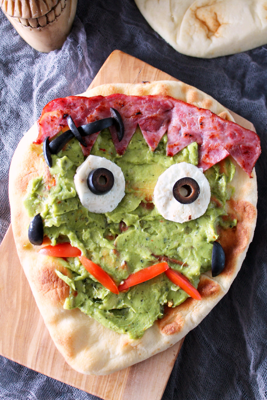 This Easy Frankenstein Breakfast Flatbread is a monstrously delicious way to start your Halloween morning! It's a spooky twist on avocado toast that's topped with guacamole, turkey bacon, egg whites, black olives, and grape tomatoes.