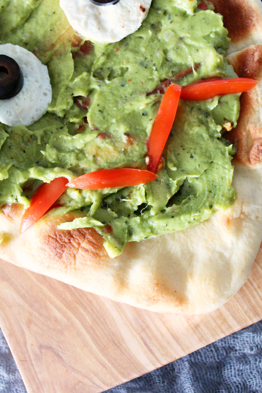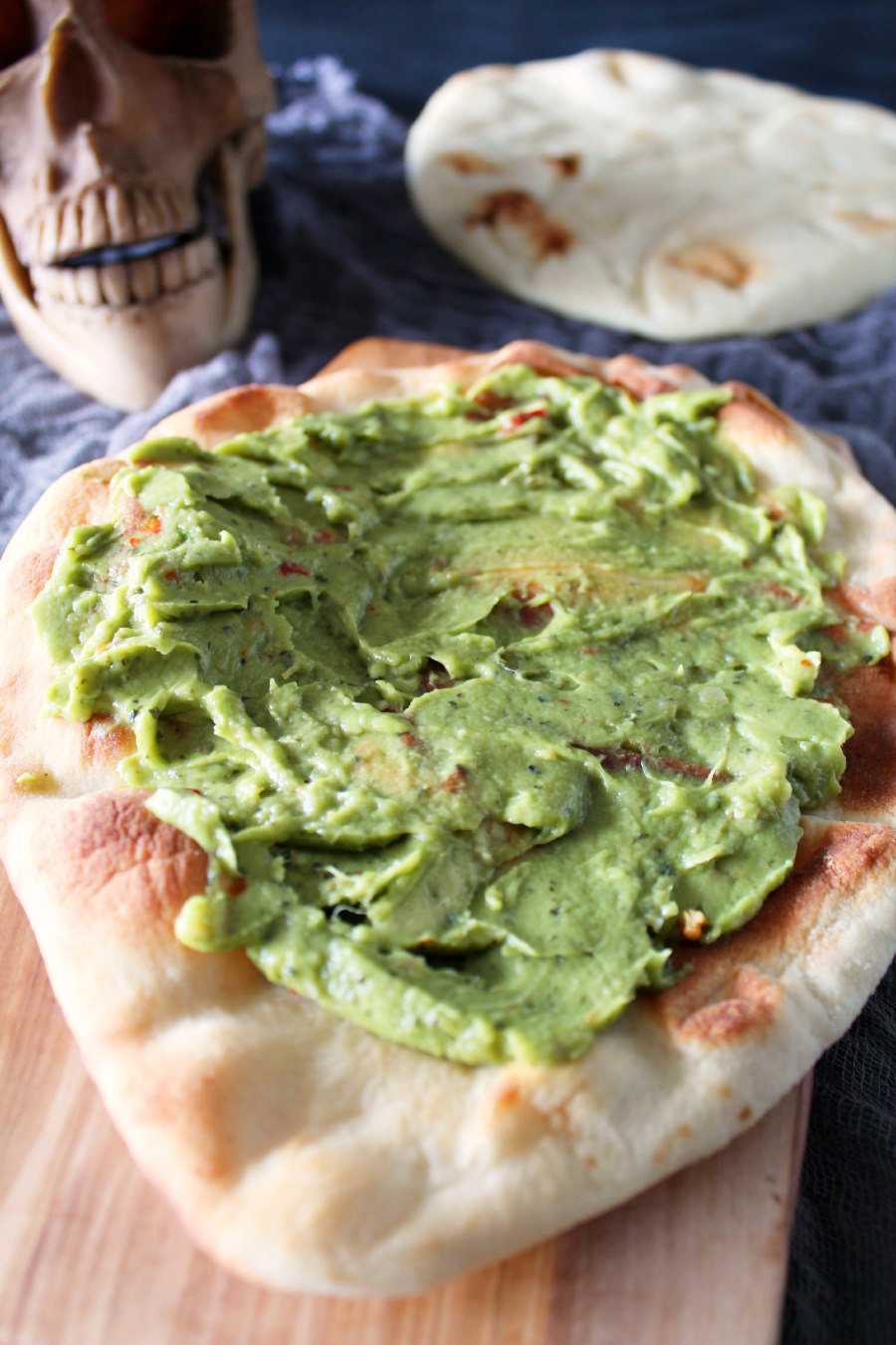 - Spread guacamole onto the flatbread. Then, begin forming the face.