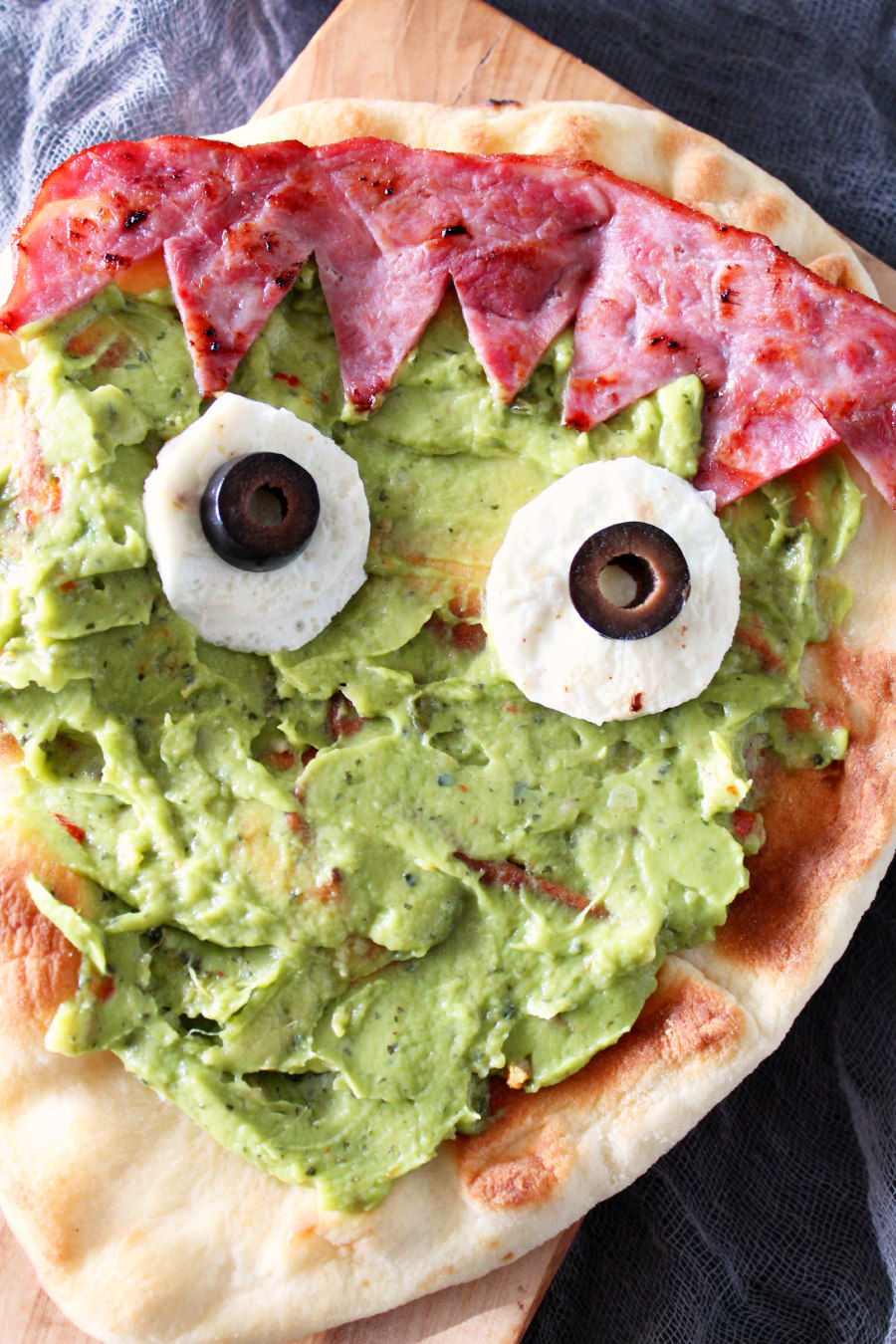 This monster of a breakfast is a great way to kick off your Halloween festivities! Especially if you're trying to get your family to eat something healthier before indulging in all of that candy goodness later on in the day! Keep some extra toppings on the side to add onto the flatbread once it's served.