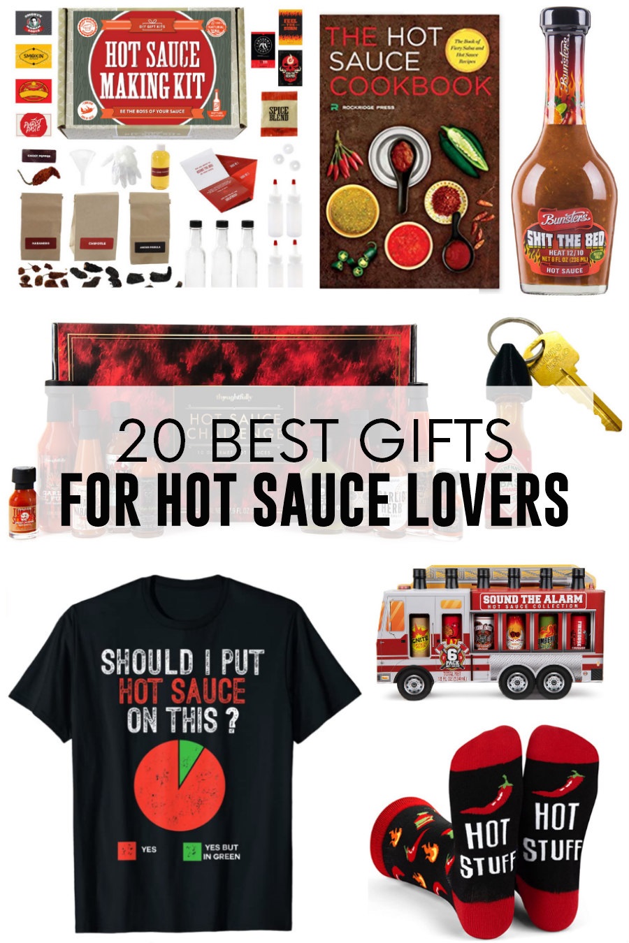 These 20 hot sauce gifts include everything from hot sauce gift sets, DIY hot sauce kits, hot sauce challenges, novelty items like shirts and socks, and a Tabasco keychain my grandmother would have loved!  Any hot sauce lover would be glad to receive any of these spicy gifts!