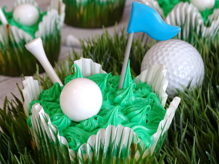 I found cupcake liners with a grassy design on them. Β You could use golf-themed cupcake liners or green cupcake liners. Β These cupcakes became a golfer's delight by sticking white golf tees in half of the cupcakes. Then, I stuck golf flag picks in the other half. Β A white gumball was popped on top to take the place of a golf ball. Β They also give these cupcakes another fun, edible element!