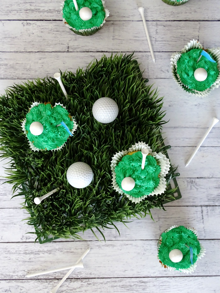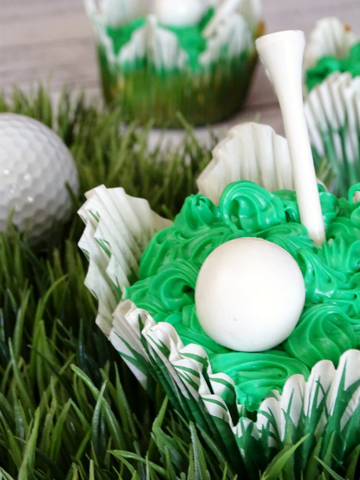 So I had the idea to bake a simple vanilla cupcake and turn it into a golf-themed dessert. Β The best part? Β All you need is boxed cake mix, green icing, and a little creativity! Β I might not know much about the game of golf itself, but I can definitely make a cupcake a hole-in-one dessert!