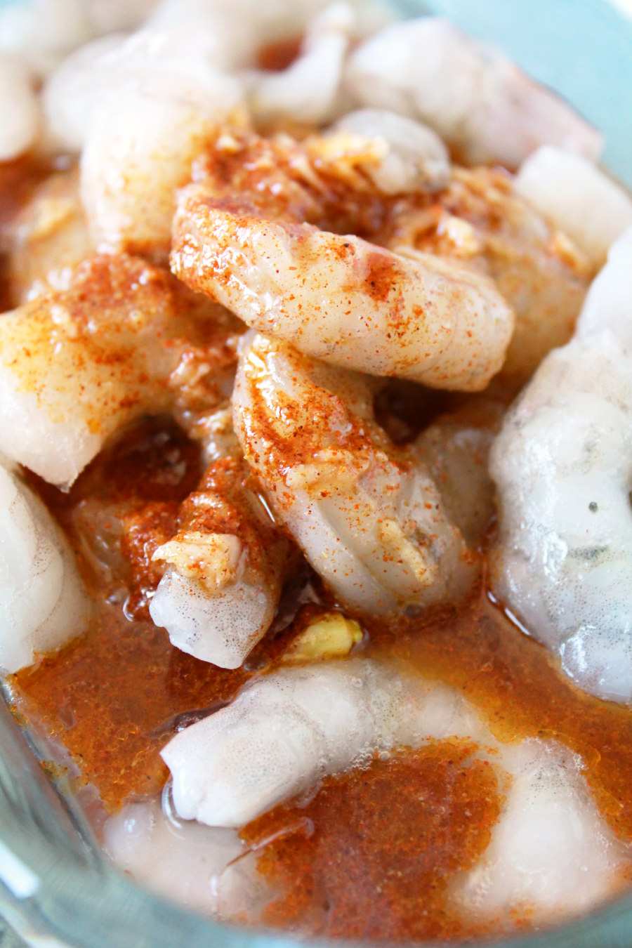 Once the marinade is mixed up, add the shrimp to a freezer bag or resealable container, pour the marinade in, toss, and refrigerate for at least 30 minutes.