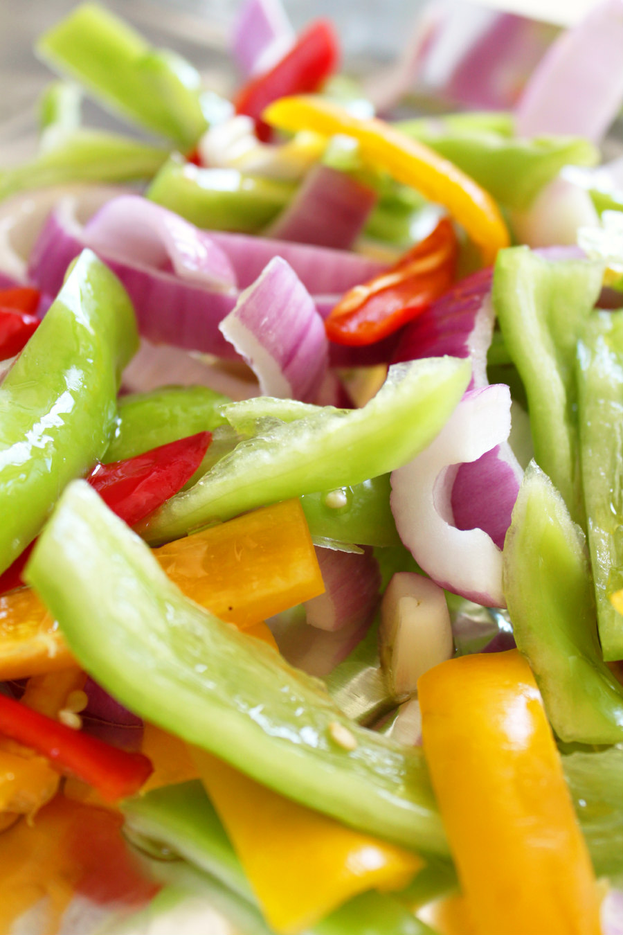 - Place the peppers and onions in foil. Drizzle with olive oil. Then fold the foil into a packet and poke holes in the top to vent.