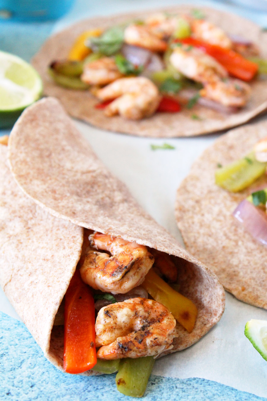 Serve the grilled shrimp, peppers, onions, and tortillas on a platter and let everyone build their own fajitas. Top them with your favorite toppings like guacamole, sour cream, hot sauce, salsa, fresh cilantro, and a squeeze of lime!