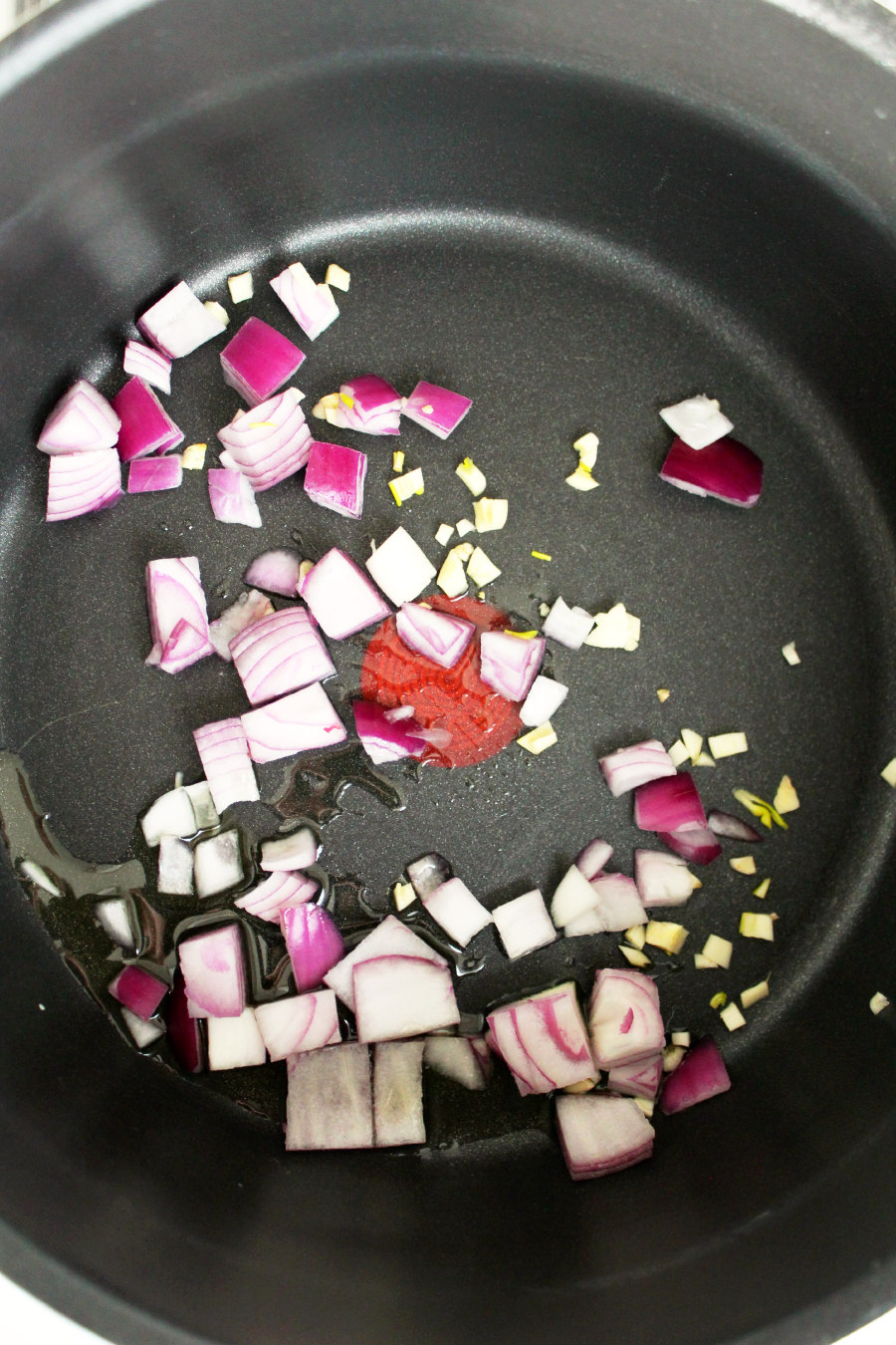 The first thing you want to do is add a little olive oil in the bottom of a pot.  Add garlic and onion and sauté until it's fragrant and the onion has softened.