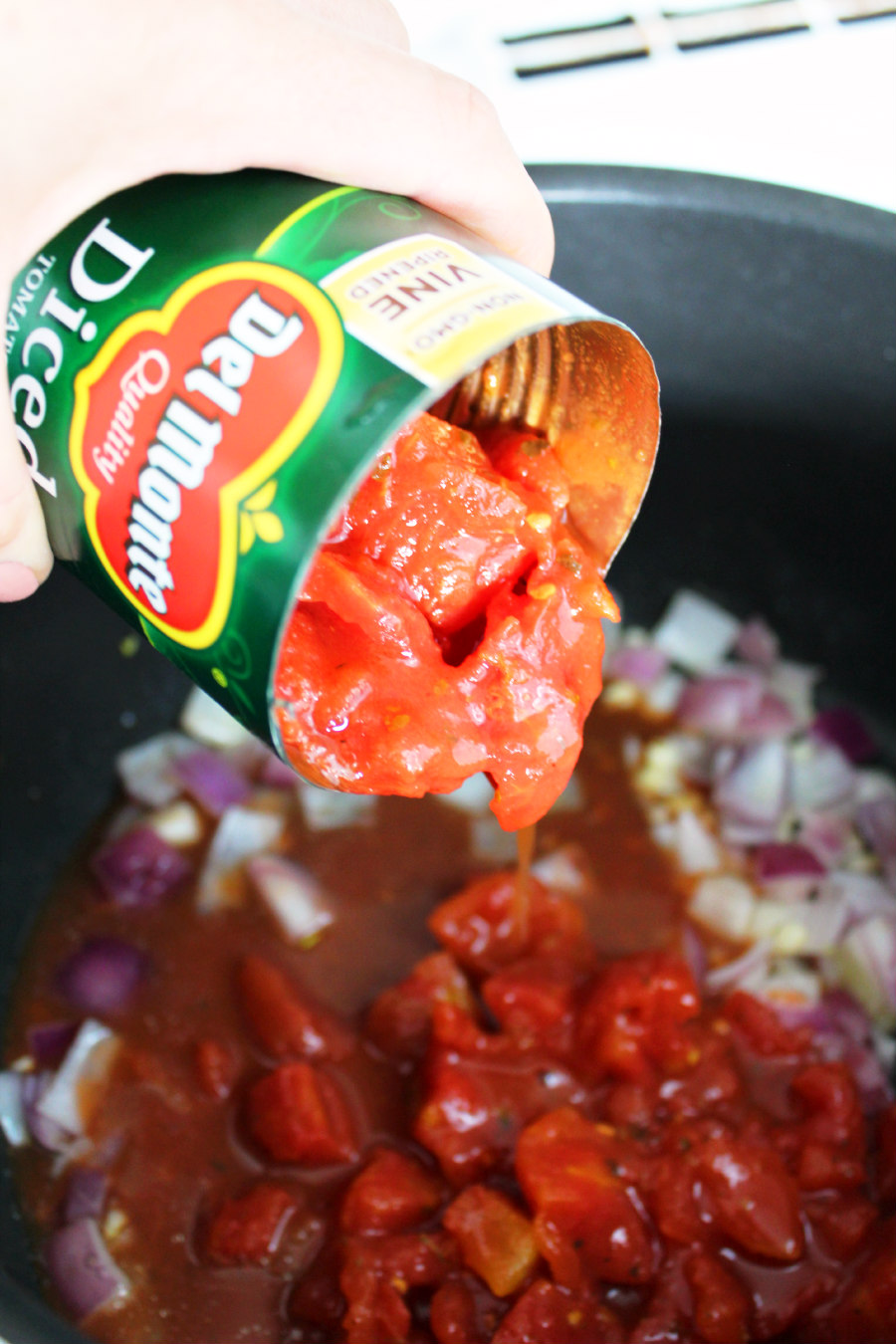 Now, add a can of diced tomatoes.  I used Del Monte seasoned diced tomatoes.  Don't drain them.  Pour the entire can in and stir it up!