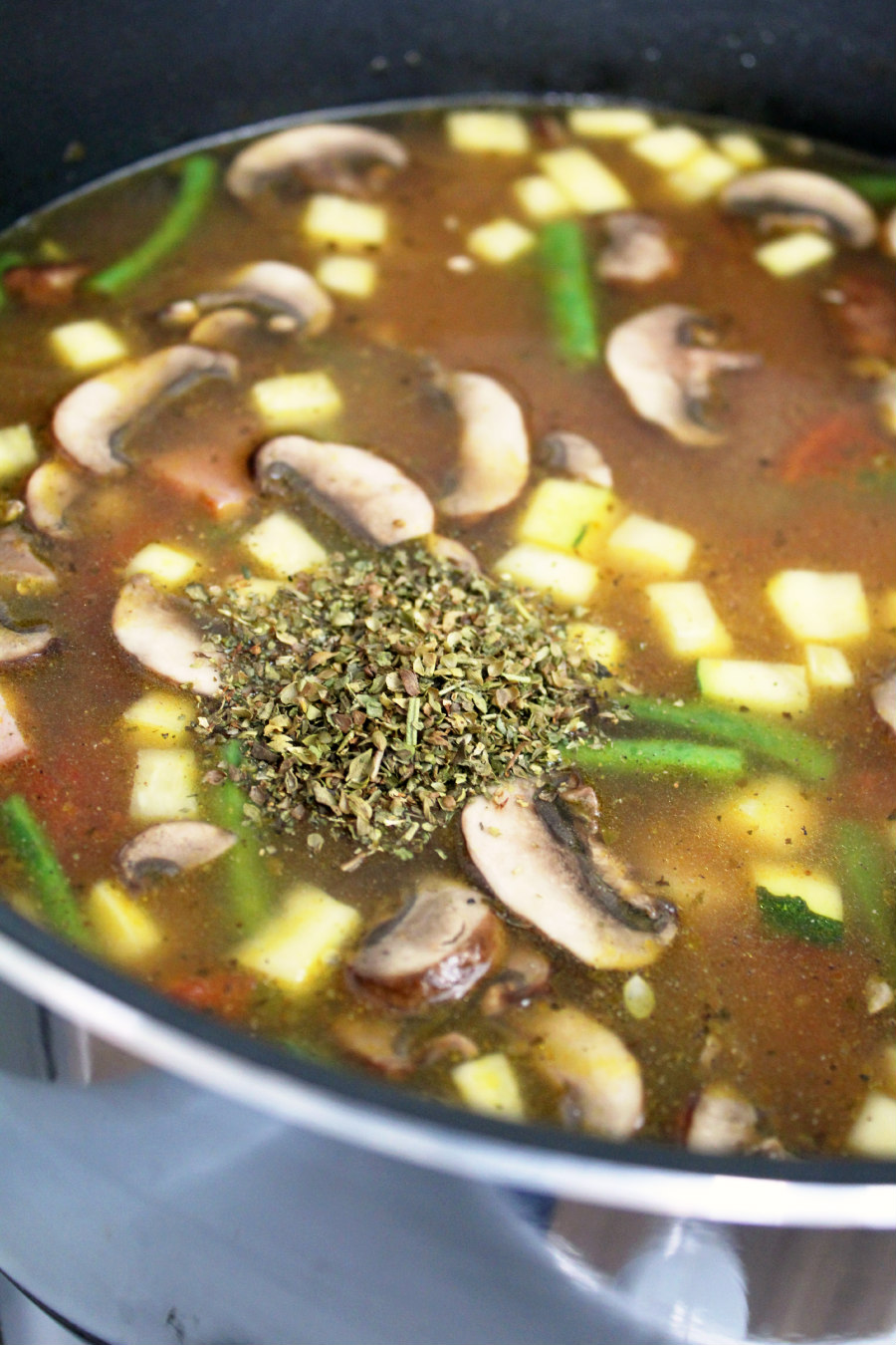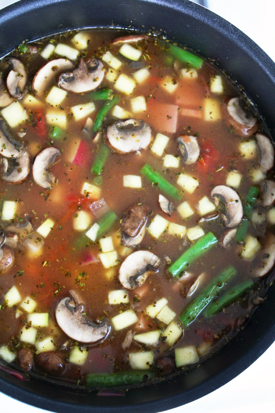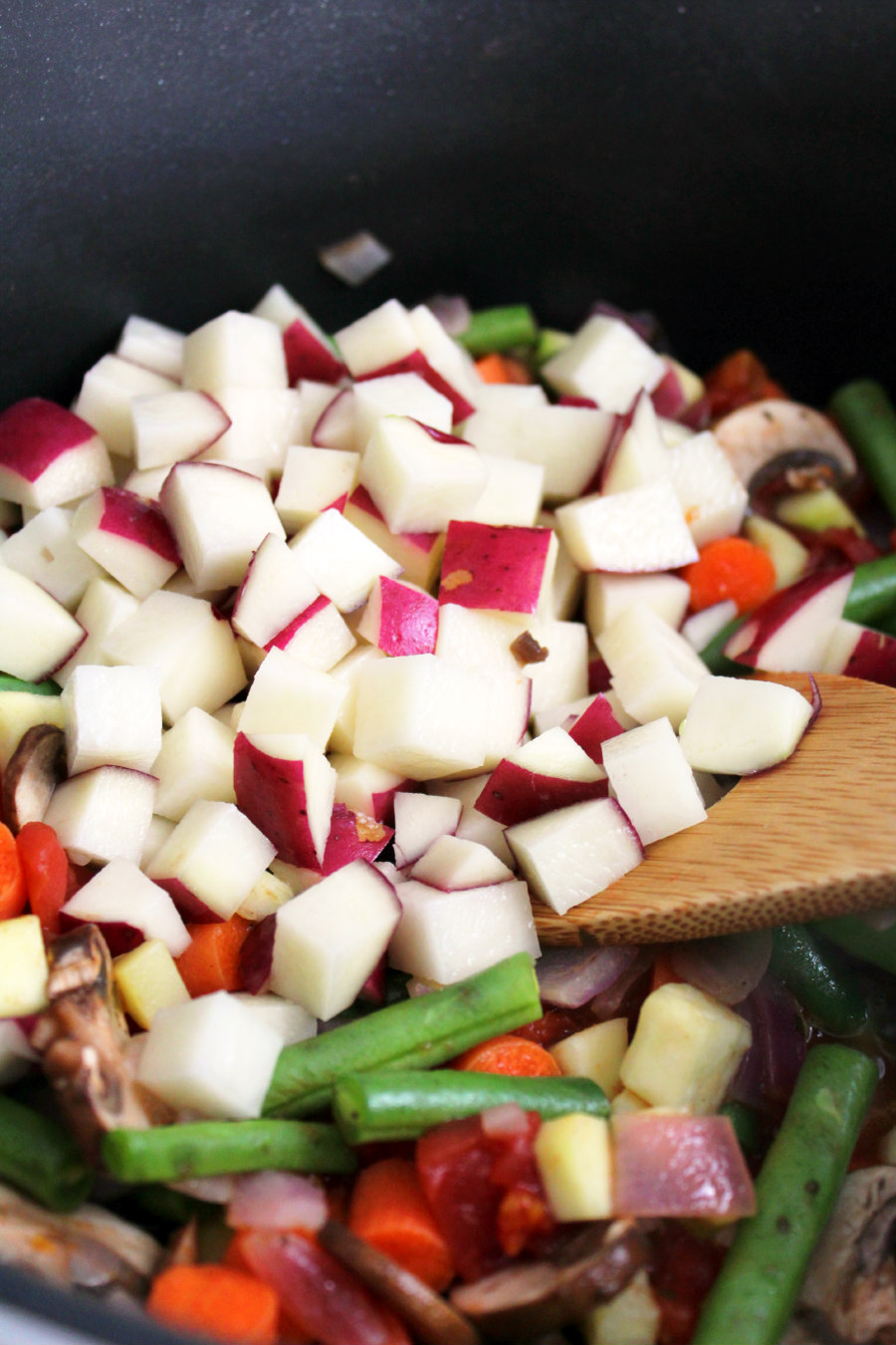 • Then, add the zucchini, carrots, green beans, mushrooms, potatoes and cook for 5-8 minutes.