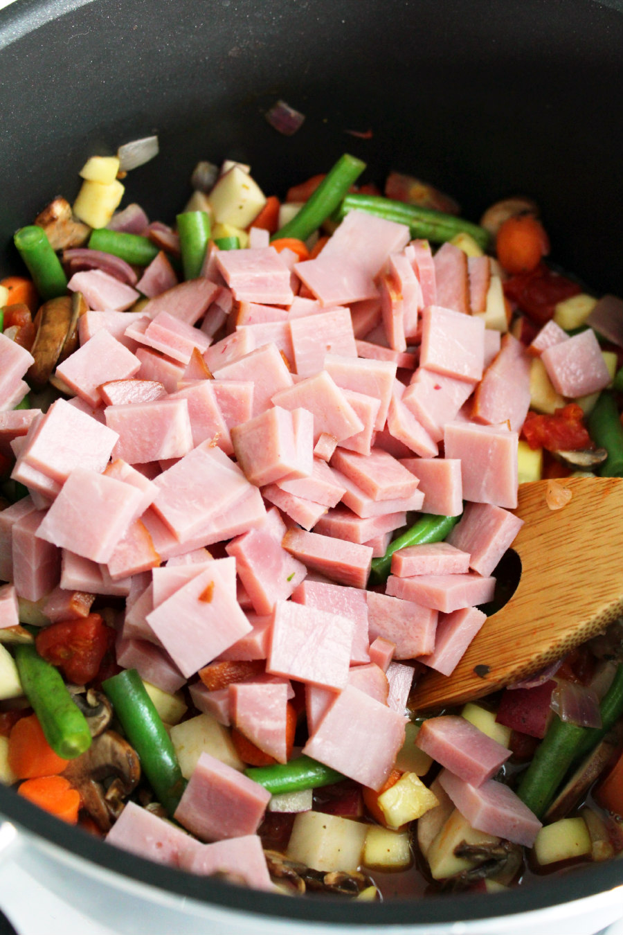 Then, I diced up some Hatfield ham and added it to the pot.  The ham adds a really nice flavor to the soup and is a great way to use up your holiday leftovers!