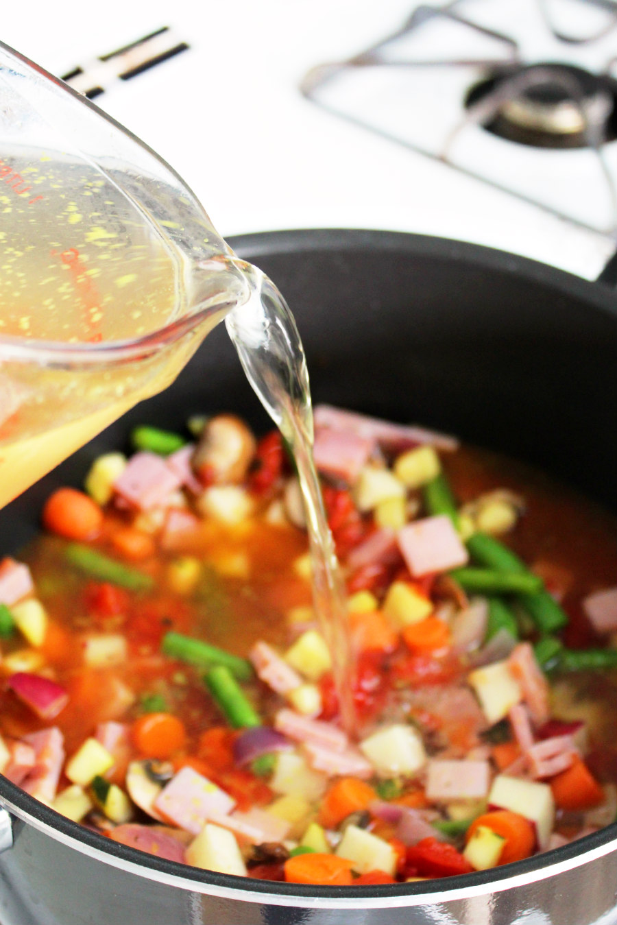 • Add the ham. Then, pour in the broth.