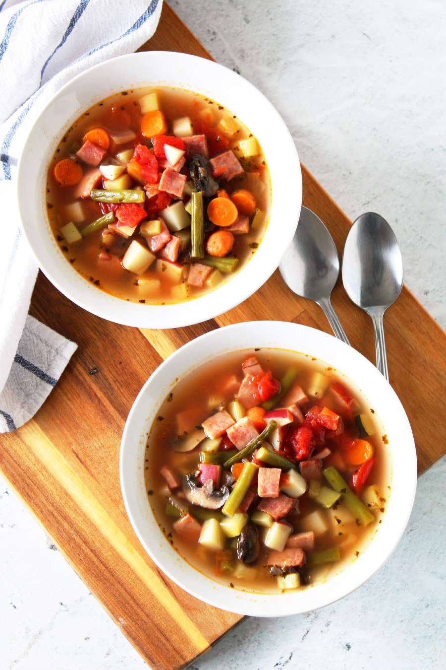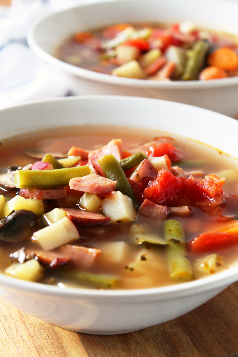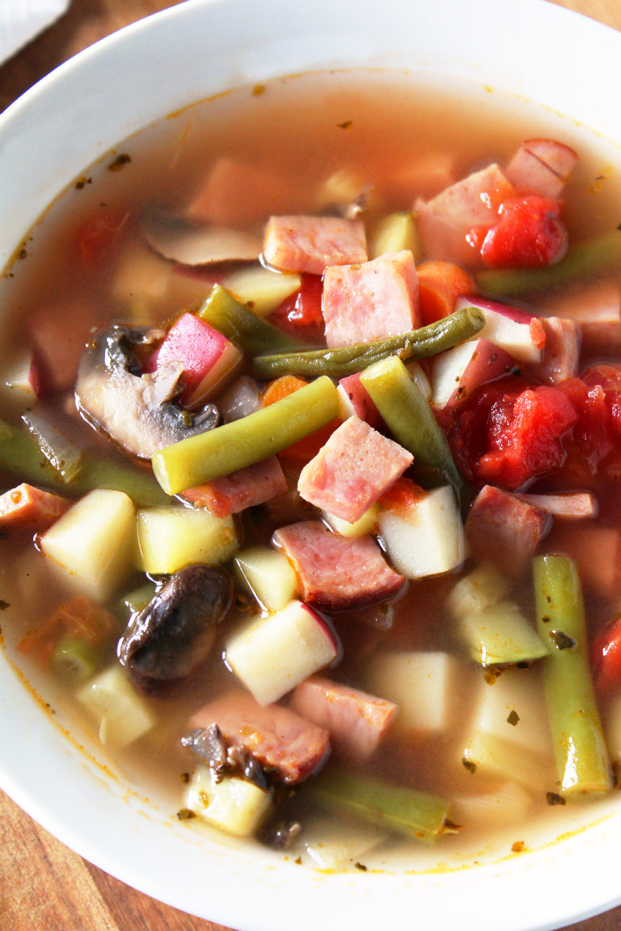 That's what I love about soup!  You can basically take any combination of ingredients and turn them into a soup recipe!  This soup has diced up ham and a variety of vegetables like zucchini, carrots, mushrooms, green beans, and potatoes.
