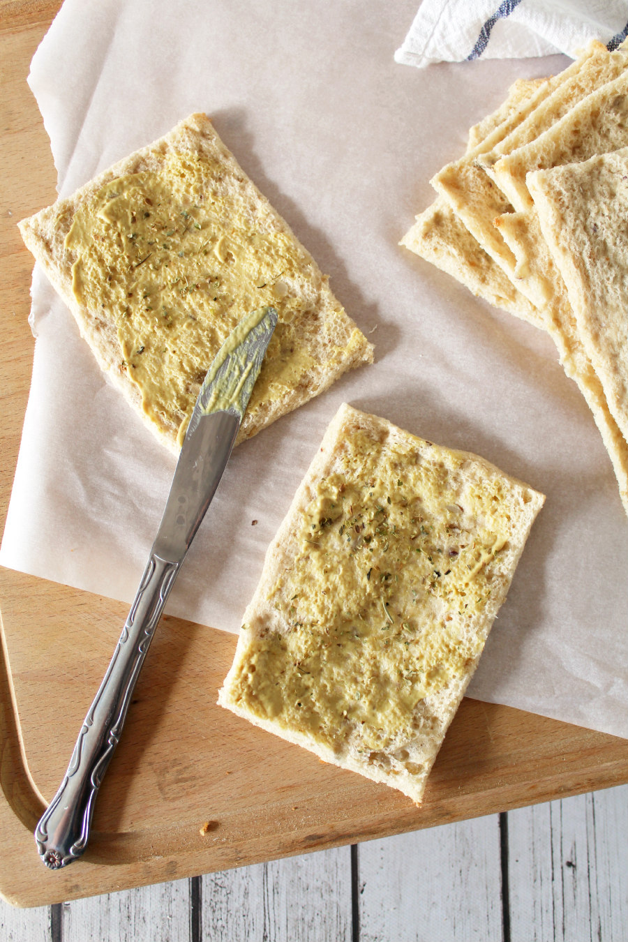 - Spread Dijon mustard onto each slice of bread and sprinkle Italian seasoning on top.