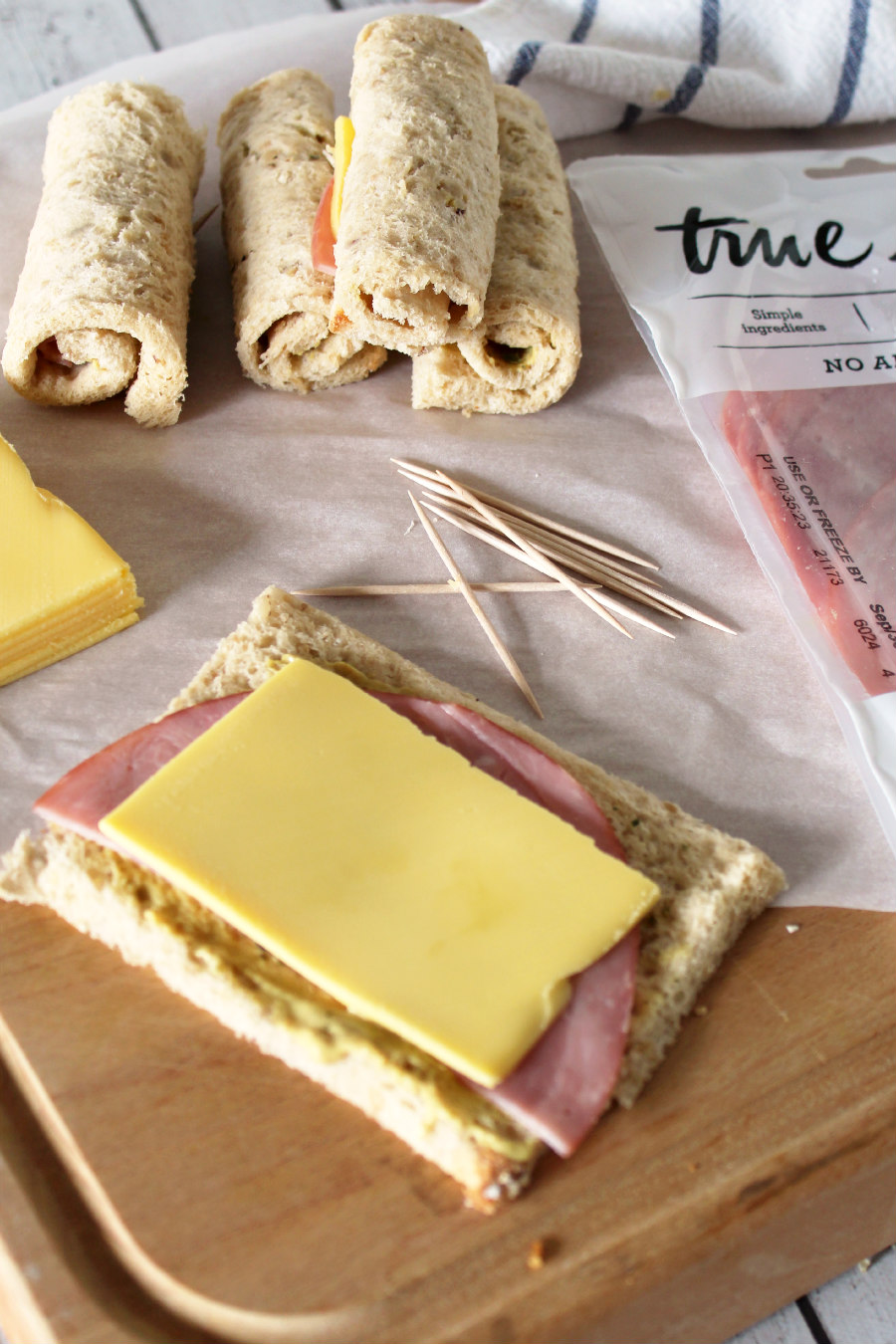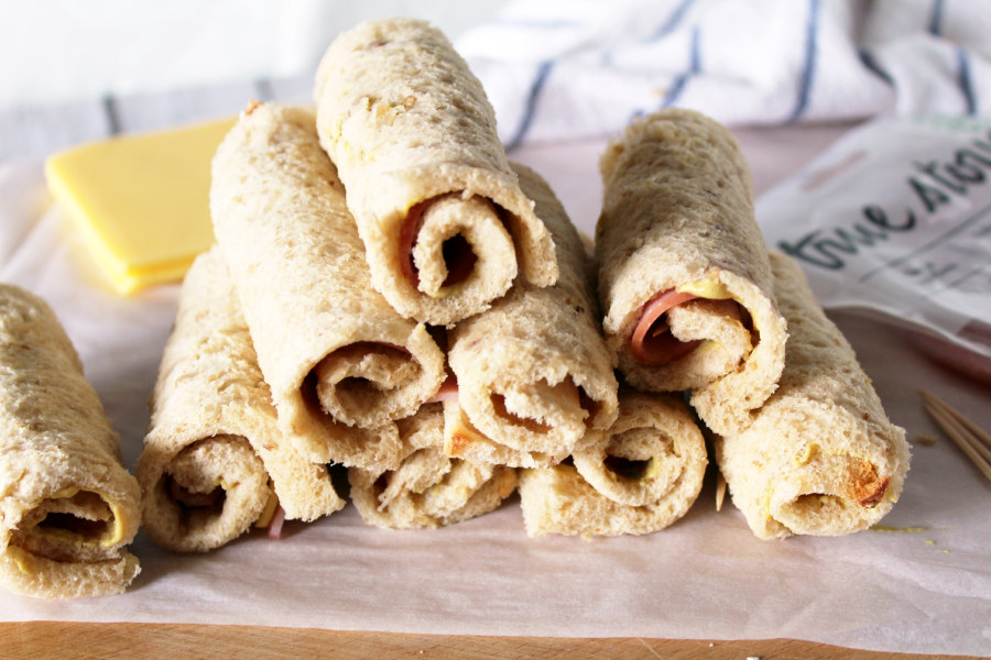 - Roll the layered bread slices up and secure with a toothpick.